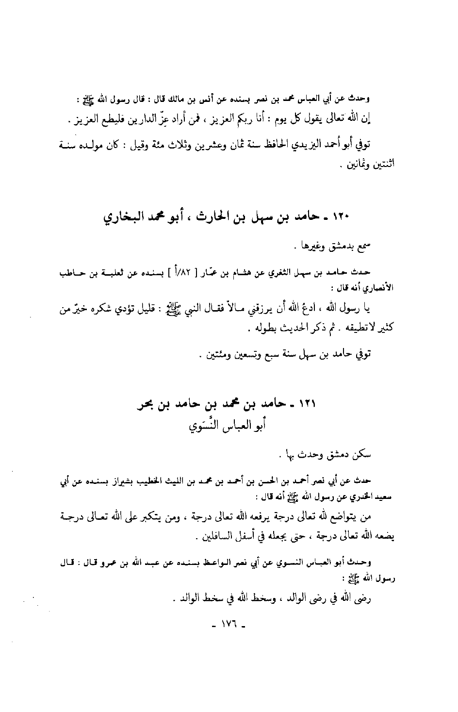 وحدث عن أبي العباس محمد بن نصر بسنده عن انس بن مالك قال: قال رسول الله صَلَّى اللهُ عَلَيْهِ وَسَلَّمَ: إن الله تعالى يقول كل يوم: أنا ربكم العزيز، فمن أراد عز الدارين فليطع العزيز.