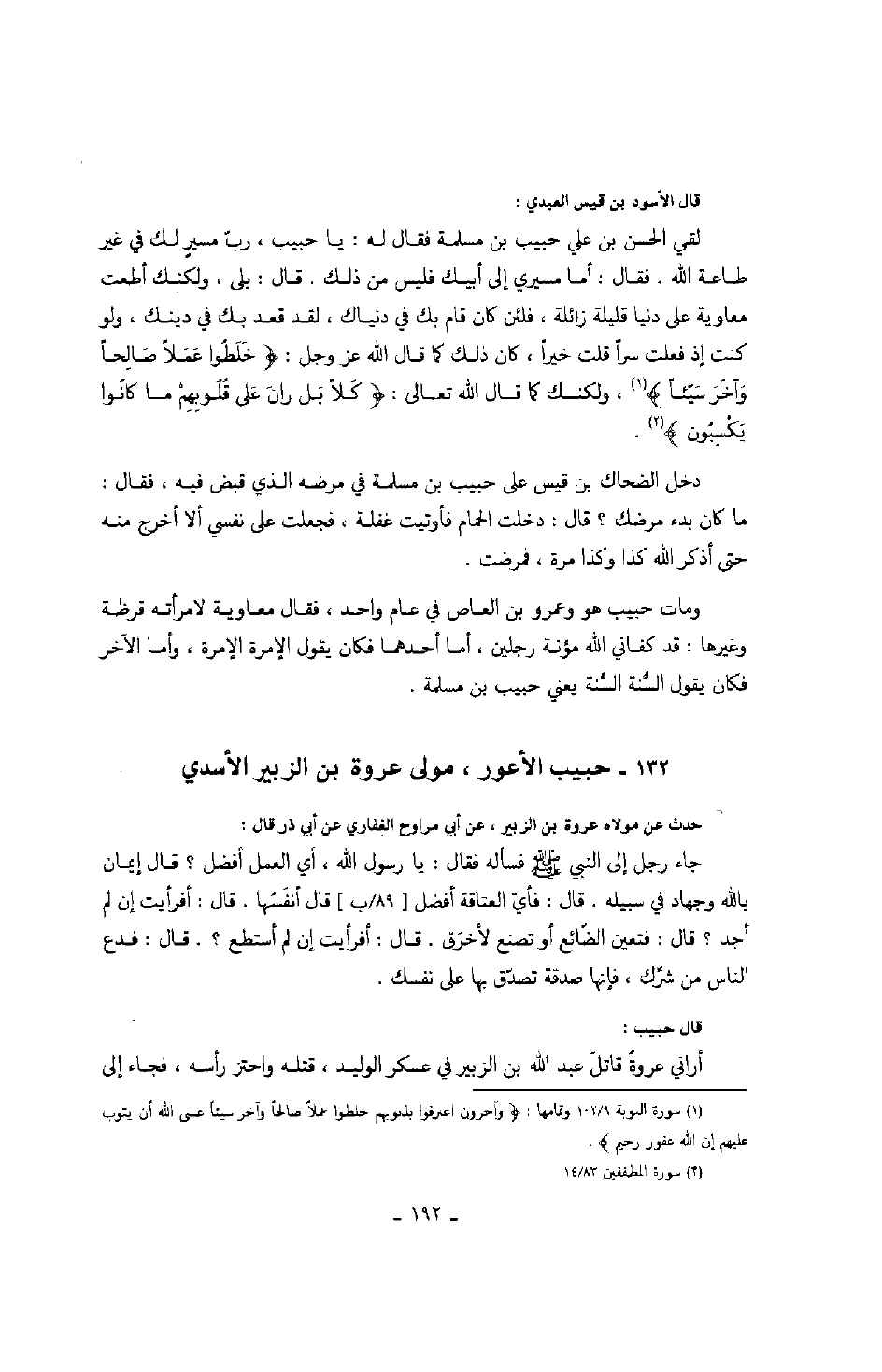 قال الأسود بن قيس: لقي الحسن بن علي حبيب بن مسلمة فقال له: يا حبيب، رب مسير لك في غير طاعة الله. فقال: أما مسيري إلى أبيك فليس من ذلك. قال: بلى، ولكنك أطعت معاوية على دنيا قليلة زائلة، فلئن كان قام بك في دنياك، لقد قعد بك في دينك، ولو كنت إذ فعلت سراً قلت خيراً، كان ذلك كما قال الله عز وجل: " خلطوا عملاً صالحاً وآخر سيئاً "، ولكنك كما قال الله تعالى: " كلا بل ران على قلوبهم ما كانوا يكسبون ".