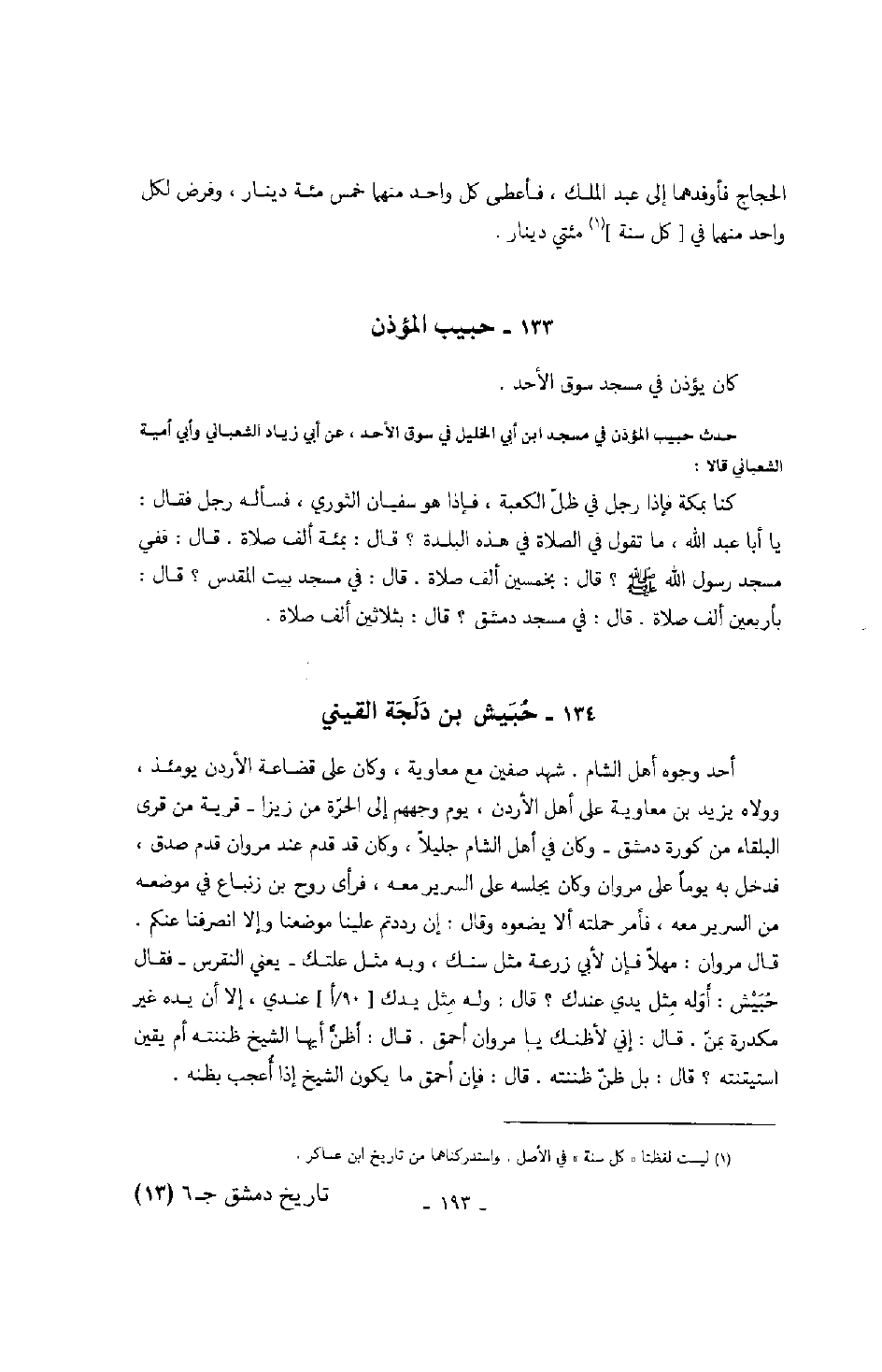 حدث حبيب المؤذن في مسجد ابن أبي الخليل في سوق الأحد، عن أبي زياد الشعباني وأبي أمية الشعباني قالا: كنا بمكة فإذا رجل في ظل الكعبة، فإذا هو سفيان الثوري، فسأله رجل فقال: يا أبا عبد الله، ما تقول في الصلاة في هذه البلدة؟ قال: بمئة ألف صلاة. قال: ففي مسجد رسول الله صَلَّى اللهُ عَلَيْهِ وَسَلَّمَ؟ قال: بخمسين ألف صلاة. قال: في مسجد بيت المقدس؟ قال: بأربعين ألف صلاة. قال: في مسجد دمشق؟ قال: بثلاثين ألف صلاة.