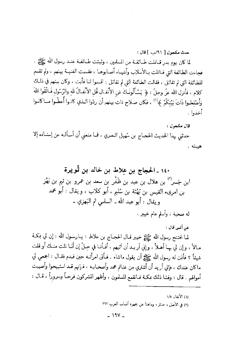 حدث مكحول قال: لما كان يوم بدر قاتلت طائفة من المسلمين، وثبتت طائفة عند رسول الله صَلَّى اللهُ عَلَيْهِ وَسَلَّمَ. فجاءت الطائفة التي قاتلت بالأسلاب وأشياء أصابوها، فقسمت الغنيمة بينهم، ولم تقسم للطائفة التي لم تقاتل، فقالت الطائفة التي لم تقاتل: اقسموا لنا فأبت، وكان بينهم في ذلك كلام، فأنزل الله عز وجل: " يسألونك عن الأنفال قل الأنفال لله والرسول فاتقوا الله وأصلحوا ذات بينكم "، فكان صلاح ذات بينهم أن ردوا الذي كانوا أعطوا ما كانوا أخذوا.