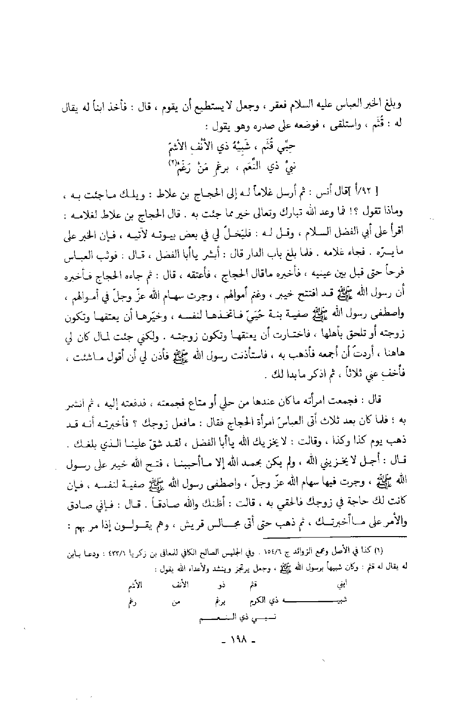 قال أنس: ثم أرسل غلاماً له إلى الحجاج بن علاط: ويلك ما جئت به، وماذا تقول؟! فما وعد الله تبارك وتعالى خير مما جئت به. قال الحجاج بن علاط لغلامه: اقرأ على أبي الفضل السلام، وقل له: فليخل لي في بعض بيوته لآتيه، فإن الخبر على ما يسره. فجاء غلامه. فلما بلغ باب الدار قال: أبشر يا أبا الفضل، قال: فوثب العباس فرحاً حتى قبل بين عينيه، فأخبره ما قال الحجاج، فأعتقه، قال: ثم جاءه الحجاج فأخبره أن رسول الله صَلَّى اللهُ عَلَيْهِ وَسَلَّمَ قد افتتح خيبر، وغنم أموالهم، وجرت سهام الله عز وجل في أموالهم، واصطفى رسول الله صَلَّى اللهُ عَلَيْهِ وَسَلَّمَ صفية بنة حيي فاتخذها لنفسه، وخيرها أن يعتقها وتكون زوجته أو تلحق بأهلها، فاختارت أن يعتقها وتكون زوجته. ولكني جئت لمال كان لي هاهنا، أردت أن أجمعه فأذهب به، فاستأذنت رسول الله صَلَّى اللهُ عَلَيْهِ وَسَلَّمَ فأذن لي أن أقول ما شئت، فأخف عني ثلاثاً، ثم اذكر ما بدا لك.