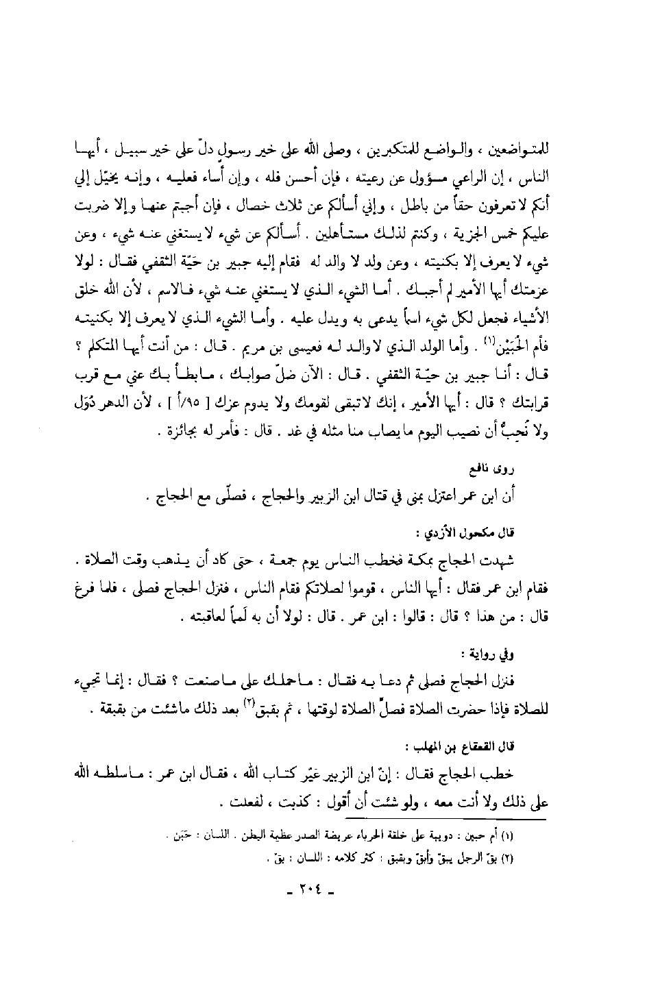 للمتواضعين، الواضع للمتكبرين، وصلى الله على خير رسول دل على خير سبيل، أيها الناس، إن الراعي مسؤول عن رعيته، فإن أحسن فله، وإن أساء فعليه، وأنه يخيل إلي أنكم لا تعرفون حقاً من باطل، وإني أسألكم عن ثلاث خصال، فإن أجبتم عنها وإلا ضربت عليكم خمس الجزية، وكنتم لذلك مستأهلين. أسألكم عن شيء لا يستغني عنه شيء، وعن شيء لا يعرف إلا بكنيته، وعن والد لا والد له فقام إليه جبير بن حية الثقفي فقال: لولا عزمتك أيها الأمير لم أجبك. أما الشيء الذي لا يستغني عنه شيء فالاسم، لأن الله خلق الأشياء فجعل لكل شيء اسماً يدعى به ويدل عليه. وأما الشيء الذي لا يعرف إلا بكنيته فأم الحبين. وأما الولد الذي لا والد له فعيسى بن مريم. قال: من أنت أيها المتكلم؟ قال: أنا جبير بن حية الثقفي. قال: الآن ضل صوابك، ما بطأ بك عني مع قرب قرابتك؟ قال: أيها الأمير، إنك لا تبقي لقومك ولا يدوم عزك، لأن الدهر دول ولا نحب أن نصيب اليوم ما يصاب منا مثله في غد. قال: فأمر له بجائزة.