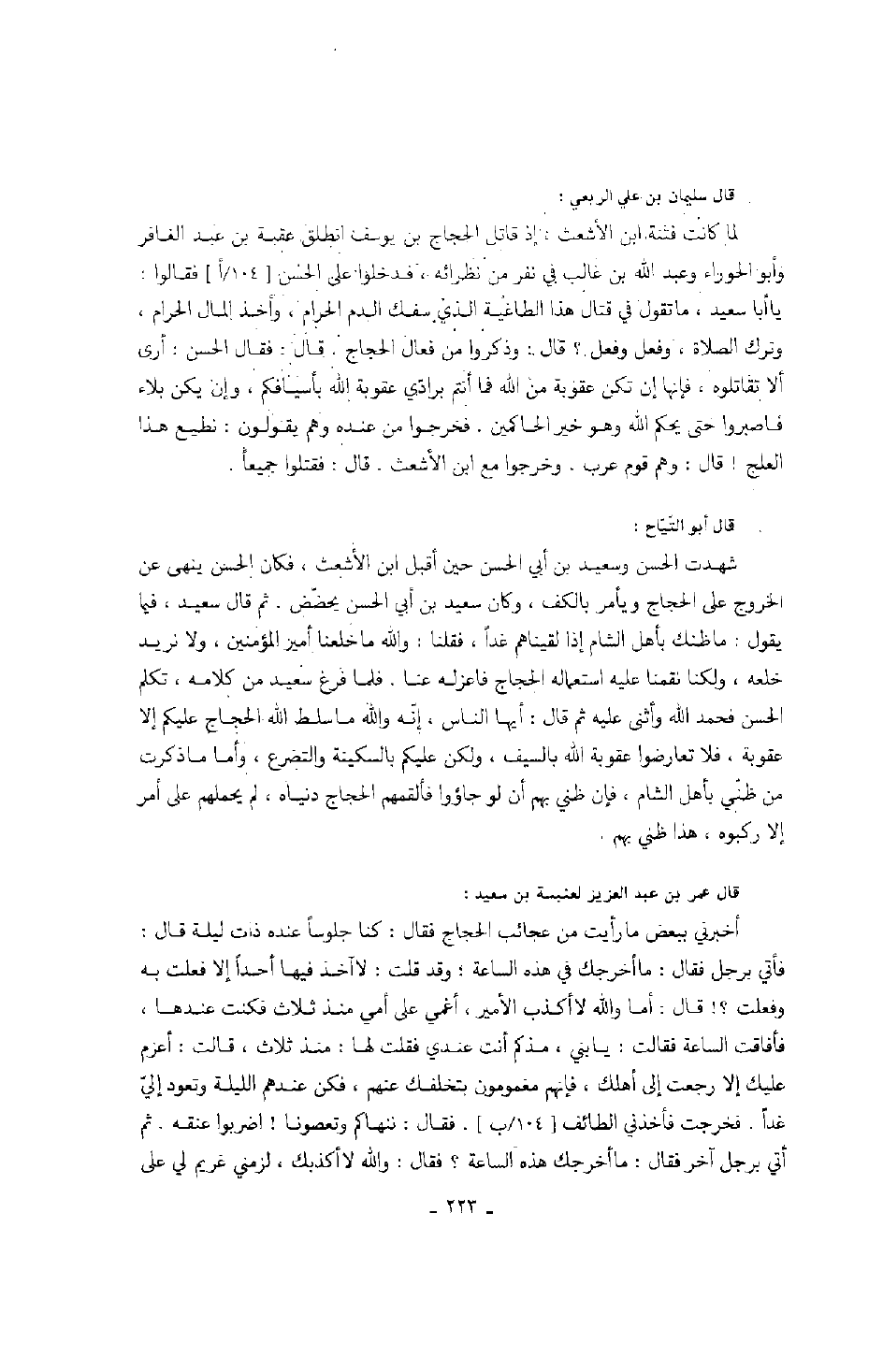 قال أبو التياح: شهدت الحسن وسعيد بن أبي الحسن حين أقبل ابن الأشعث، فكان الحسن ينهى عن الخروج على الحجاج ويأمر بالكف، وكان سعيد بن أبي الحسن يحضض. ثم قال سعيد، فيما يقول: ما ظنك بأهل الشام إذا لقيناهم غداً، فقلنا: والله ما خلعنا أمير المؤمنين، ولا نريد خلعه، ولكنا نقمنا عليه استعماله الحجاج فاعزله عنا. فلما فرغ سعيد من كلامه، تكلم الحسن فحمد الله وأثنى عليه ثم قال: أيها الناس، إنّه والله ما سلط الله الحجاج عليكم إلا عقوبة، فلا تعارضوا عقوبة الله بالسيف، ولكن عليكم بالسكينة والتضرع، وأما ما ذكرت من ظنّي بأهل الشام، فإن ظني بهم أن لو جاؤوا فألقمهم الحجاج دنياه، لم يحملهم على أمر إلا ركبوه، هذا ظني بهم.