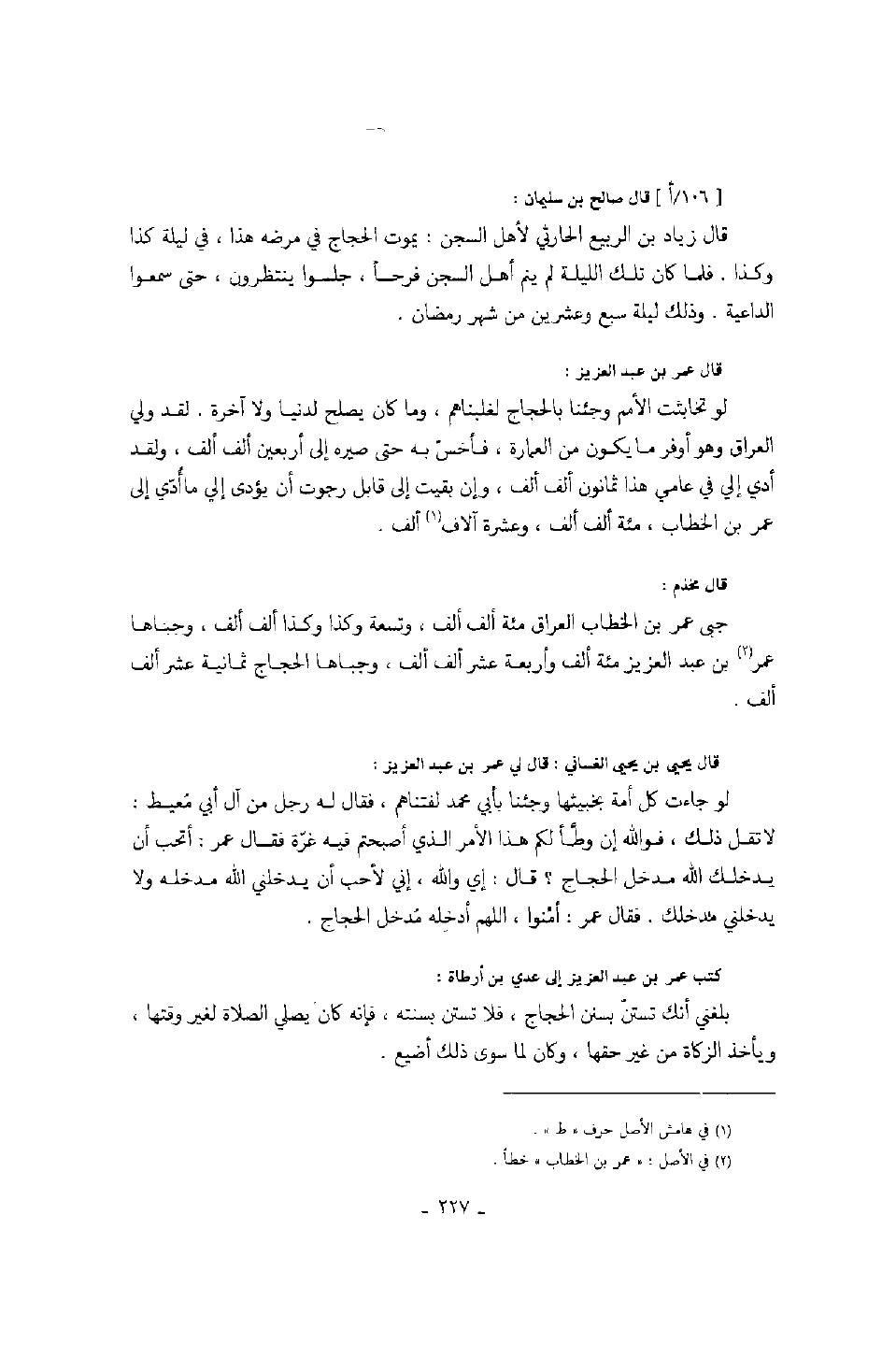 كتب عمر بن عبد العزيز إلى عدي بن أرطأة: بلغني أنك تستنّ بسنن الحجاج، فلا تستن بسنته، فإنه كان يصلي الصلاة لغير وقتها، ويأخذ الزكاة من غير حقها، وكان لما سوى ذلك أضيع.