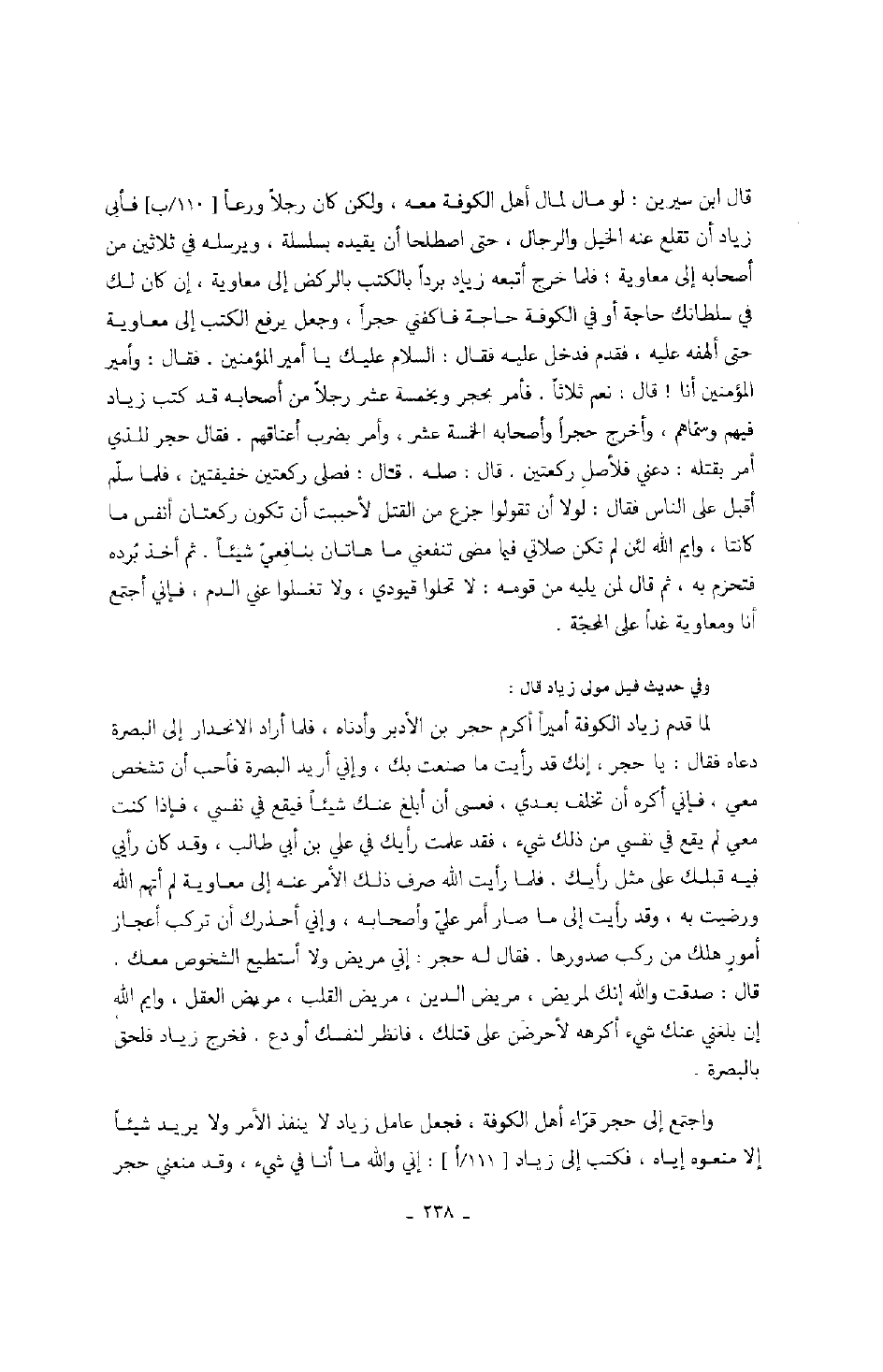 وفي حديث فيل مولى زياد قال: لما قدم زياد الكوفة أميراً أكرم حجر بن الأدبر وأدناه، فلما أراد الانحدار إلى البصرة دعاه فقال: يا حجر، إنك قد رأيت ما صنعت بك، وإني أريد البصرة فأحب أن تشخص معي، فإني أكره أن تخلف بعدي، فعسى أن أبلغ عنك شيئاً فيقع في نفسي، فإذا كنت معي، لم يقع في نفسي من ذلك شيء، فقد علمت رأيك في علي بن أبي طالب، وقد كان رأيي فيه قبلك على مثل رأيك. فلما رأيت الله صرف ذلك الأمر عنه إلى معاوية لم أتهم الله ورضيت به، وقد رأيت إلى ما صار أمر عليّ وأصحابه، وإني أحذر كأن تركب أعجاز أمور هلك من ركب صدورها. فقال له حجر: إني مريض ولا أستطيع الشخوص معك. قال: صدقت والله إنك لمريض، مريض الدين، مريض القلب، مريض العقل، وايم الله إن بلغني عنك شيء أكرهه لأحرضن على قتلك، فانظر لنفسك أو دع. فخرج زياد فلحق بالبصرة.