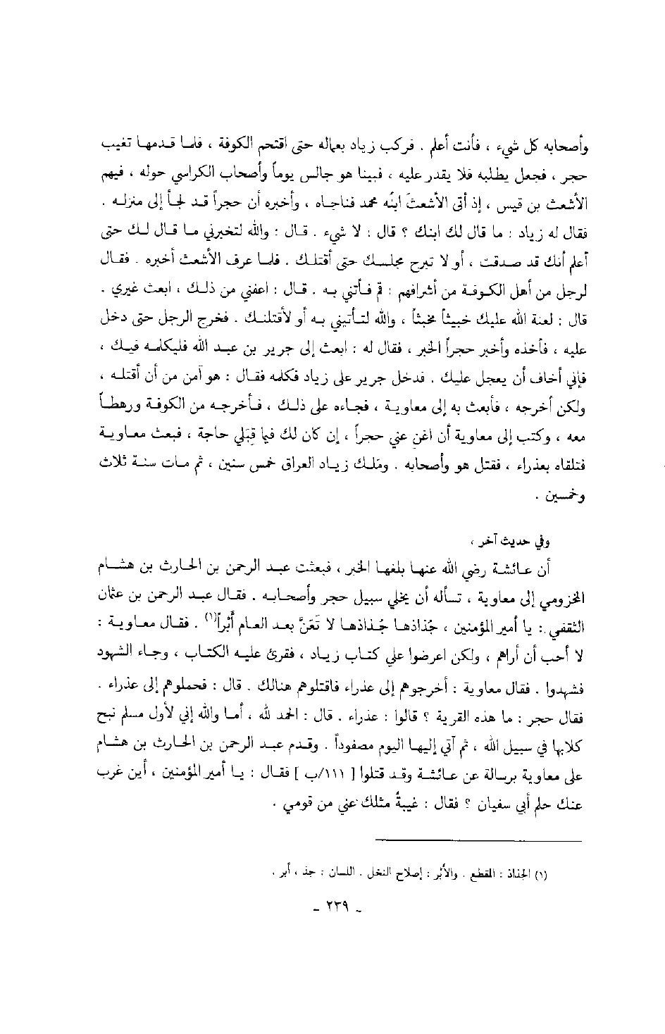 وأصحابه كل شيء، فأنت أعلم. فركب زياد بعماله حتى اقتحم الكوفة، فلما قدمها تغيب حجر، فجعل يطلبه فلا يقدر عليه، فبينا هو جالس يوماً وأصحاب الكراسي حوله، فيهم الأشعث بن قيس، إذ أتى الأشعث ابنه محمد فناجاه، وأخبره أن حجراً قد لجأ إلى منزله. فقال له زياد: ما قال لك ابنك؟ قال: لا شيء. قال: والله لتخبرني ما قال لك حتى اعلم أنك قد صدقت، أو لا تبرح مجلسك حتى أقتلك. فلما عرف الأشعث أخبره. فقال لرجل من أهل الكوفة من أشرافهم: قم فأتني به. قال: اعفني من ذلك، ابعث غيري. قال: لعنة الله عليك خبيثاً مخبثاً، والله لتأتيني به أو لأقتلنك. فخرج الرجل حتى دخل عليه، فأخذه وأخبر حجراً الخبر، فقال له: ابعث إلى جرير بن عبد فليكلمه فيك، فإني أخاف أن يعجل عليك. فدخل جرير على زياد فكلمه فقال: هو أمن من أن أقتله، ولكن أخرجه، فأبعث به إلى معاوية، فجاءه على ذلك، فأخرجه من الكوفة ورهطاً معه، وكتب إلى معاوية أن اغن عني حجراً، إن كان لك فيما قبلي حاجة، فبعث معاوية فتلقاه بعذراء، فقتل هو وأصحابه. وملك زياد العراق خمس سنين، ثم مات سنة ثلاث وخمسين.