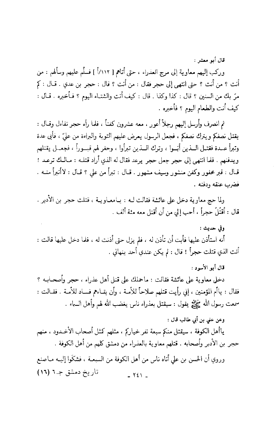 قال أبو الأسود: دخل معاوية على عائشة فقالت: ما حملك على قتل أهل عذراء، حجر وأصحابه؟ فقال: يا أم المؤمنين، إني رأيت قتلهم صلاحاً للأمة، وأن بقاءهم فساد للأمة. فقالت: سمعت رسول الله صَلَّى اللهُ عَلَيْهِ وَسَلَّمَ يقول: سيقتل بعذراء ناس يغضب الله لهم وأهل السماء.