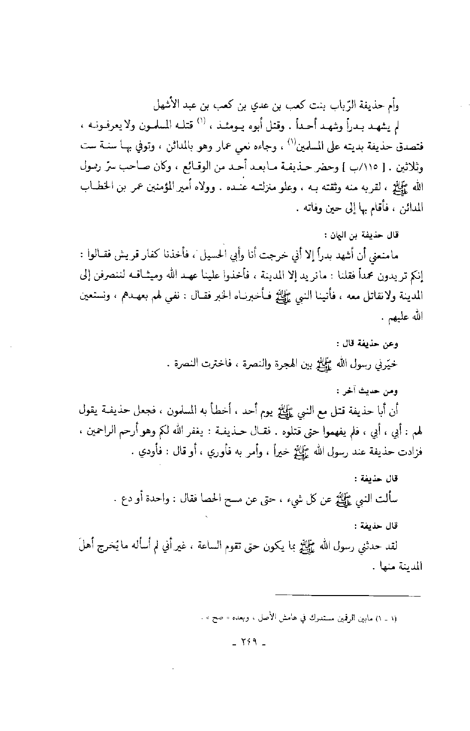 وأم حذيفة الرّباب بنت كعب بن عدي بن كعب بن عبد الأشهل. لم يشهد بدراً وشهد أحداً. وقتل أبوه يومئذ، قتله المسلمون ولا يعرفونه، فتصدق حذيفة بديته على المسلمين، وجاءه نعي عمار وه بالمدائن، وتوفي بها سنة ست وثلاثين. وحضر حذيفة ما بعد أحد من الوقائع، وكان صاحب سرّ رسول الله صَلَّى اللهُ عَلَيْهِ وَسَلَّمَ، لقربه منه وثقته به، وعلو منزلته عنده. وولاه أمير المؤمنين عمر بن الخطاب المدائن، فأقام بها إلى حين وفاته.