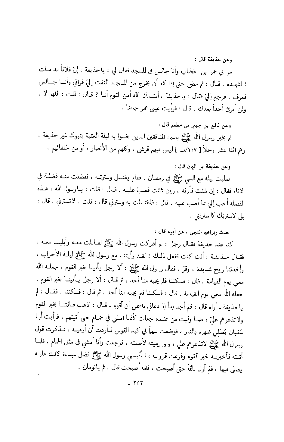حدث إبراهيم التيمي، عن أبيه قال: كنا عند حذيفة فقال رجل: لو أدركت رسول الله صَلَّى اللهُ عَلَيْهِ وَسَلَّمَ لقاتلت معه وأبليت معه، فقال حذيفة: أنت كنت تفعل ذلك! لقد رأيتنا مع رسول الله صَلَّى اللهُ عَلَيْهِ وَسَلَّمَ ليلة الأحزاب، وأخذتنا ريح شديدة، وقرّ فقال رسول الله صَلَّى اللهُ عَلَيْهِ وَسَلَّمَ: ألا رجل يأتينا بخبر القوم، جعله الله معي يوم القيامة. قال: فسكتنا فلم يجبه منا أحد، ثم قال: ألا رجل يأتينا بخبر القوم، جعله الله معي يوم القيامة. قال: فسكتنا فلم يجبه منا أحد. ثم قال: فسكتنا. فقال: قم يا حذيفة - أراه قال: فلم أجد بداً إذ دعاني باسمي أن أقوم - قال: اذهب فائتنا بخبر القوم ولا تذعرهم عليّ، فلما وليت من عنده جعلت كأنما أمشي في حمام حتى أتيتهم، فرأيت أبا سفيان يصلي ظهره بالنار، فوضعت سهماً في كبد القوس فأردت أن أرميه، فذكرت قول رسول الله صَلَّى اللهُ عَلَيْهِ وَسَلَّمَ لا تذعرهم علي، ولو رميته لأصبته، فرجعت وأنا أمشي في مثل الحمام، فلما أتيته فأخبرته خبر القوم وفرغت قررت، فألبسني رسول الله صَلَّى اللهُ عَلَيْهِ وَسَلَّمَ فضل عباءة كانت عليه يصلي فيها، فلم أزل نائماً حتى أصبحت، فلما أصبحت قال: قم يانومان.