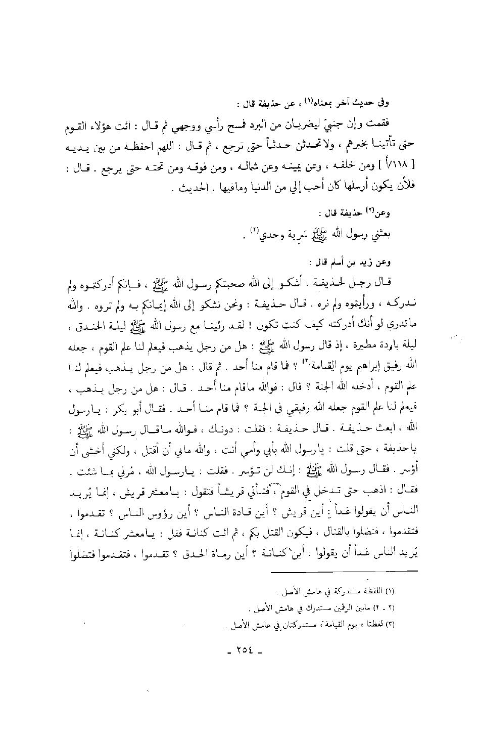 وعن زيد بن أسلم قال: قال رجل لحذيفة: أشكو إلى الله صحبتكم رسول الله صَلَّى اللهُ عَلَيْهِ وَسَلَّمَ، فإنكم أدركتموه ولم ندركه، ورأيتموه ولم نره. قال حذيفة: ونحن نشكو إلى الله إيمانكم به ولم تروه. والله ماتدري لو أنك أدركته كيف كنت تكون! لقد رئينا مع رسول الله صَلَّى اللهُ عَلَيْهِ وَسَلَّمَ ليلة الخندق، ليلة باردة مطيرة، إذ قال رسول الله صَلَّى اللهُ عَلَيْهِ وَسَلَّمَ: هل من رجل يذهب فيعلم لنا علم القوم، جعله الله رفيق إبراهيم يوم القيامة؟ فما قام منا أحد. ثم قال: هل من رجل يذهب فيعلم لنا علم القوم، أدخله الله الجنة؟ قال: فوالله ما قام منا أحد. قال: هل من رجل يذهب، فيعلم لنا علم القوم جعله الله رفيقي في الجنة؟ فما قام منا أحد. فقال أبو بكر: يا رسول الله، ابعث حذيفة. قال حذيفة: فقلت: دونك، فوالله ما قال رسول الله صَلَّى اللهُ عَلَيْهِ وَسَلَّمَ: يا حذيفة، حتى قلت: يا رسول الله بأبي وأمي أنت، والله ما بي أن أقتل، ولكني أخشى أن أؤسر. فقال رسول الله صَلَّى اللهُ عَلَيْهِ وَسَلَّمَ: إنك لن تؤسر. فقلت: يا رسول الله، مرني بما شئت. فقال: اذهب حتى تدخل في القوم، فتأتي قريشاً فتقول: يا معشر قريش، إنما يريد الناس أن يقولوا غداً: أين قريش؟ أين قادة الناس؟ أين رؤوس الناس؟ تقدموا، فتقدموا، فتضلوا بالقتال، فيكون القتل بكم، ثم ائت كنانة فقل: يا معشر كنانة، إنما يريد الناس غداً أن يقولوا: أين كنانة؟ أين رماة الحدق؟ تقدموا، فتقدموا فتضلوا
