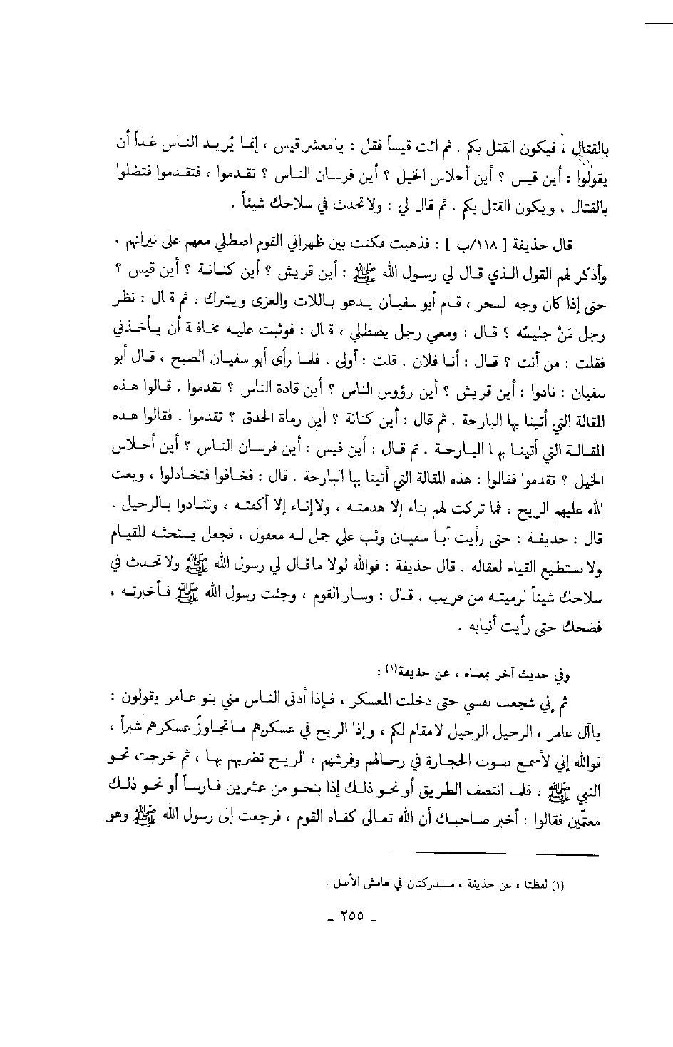 وفي حديث آخر بمعناه، عن حذيفة: ثم إني شجعت نفسي حتى دخلت المعسكر، فإذا أدنى الناس مني بنو عامر يقولون: يا آل عامر، الرحيل الرحيل لا مقام لكم، وإذا الريح في معسكرهم ما تجاوز عسكرهم شبراً، فوالله إني لأسمع صوت الحجارة في رحالهم وفرشهم، الريح تضربهم بها، ثم خرجت نحو النبي صَلَّى اللهُ عَلَيْهِ وَسَلَّمَ، فلما انتصف الطريق أو نحو ذلك إذا بنحو من عشرين فارساً أو نحو ذلك معتّمين فقالوا: أخبر صاحبك أن الله تعالى كفاه القوم، فرجعت إلى رسول الله صَلَّى اللهُ عَلَيْهِ وَسَلَّمَ وهو