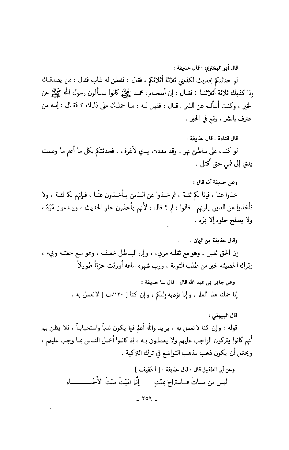 وعن حذيفة أنه قال: خذوا عنا، فإنا لكم ثقة، ثم خذوا عن الذين يأخذون عنا، فإنهم لكم ثقة، ولا تأخذوا عن الذين يلونهم. قالوا: لم؟ قال: لأنهم يأخذون حلو الحديث، ويدعون مره، ولا يصلح حلوه إلا بمره.