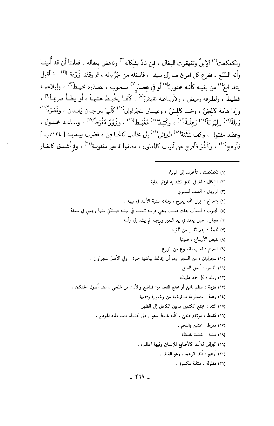 وتكعكعت الإبل وتقهقرت البغال، فمن ناد بشكاله وناهض بعقاله، فعلمنا أن قد أتينا وأنه السبع، ففزع كل امرئ منا إلى سيفه، فاستله من جربانه، ثم وقفنا زردقا. فأقبل يتظالع من بغيه كأنه مجنوب أو في هجار مسحوب، لصدره نحيط، ولبلاعيمه غطيط، ولطرفه وميض، ولأرساغه نقيض، كأنما يخبط هشيماً، أو يطأ صريماً، وإذا هامة كالمجن، وخد كالمسن، وعينان سجراوان كأنهما سراجان يقدان، وقصرة ربلة ولهزمة رهلة، وكتد مغبط، وزور مفرط، وساعد مجدول، وعضد مفتول، وكف شثنة البراثن إلى مخالب كالمحاجن، فضرب بيديه فأرهج، وكشر فأفرج عن أنياب كالمعاول، مصقولة غير مفلولة، وفم أشدق كالغار