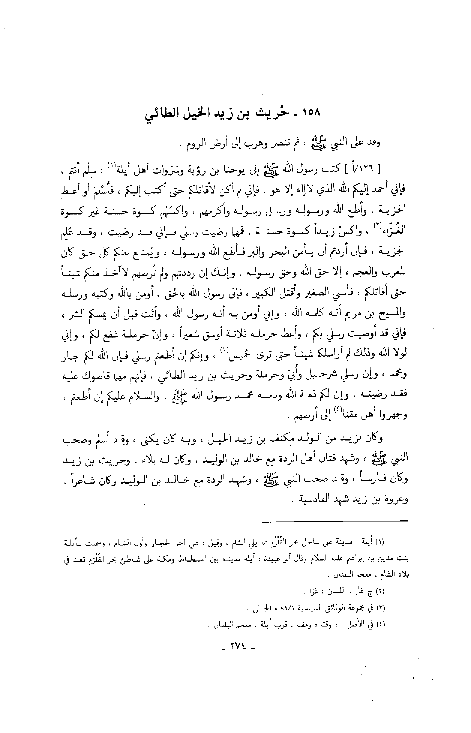 كتب رسول الله صَلَّى اللهُ عَلَيْهِ وَسَلَّمَ إلى يوحنا بن رؤبة وسروات أهل أيلة: سلم أنتم، فإني أحمد إليكم الله الذي لا إله إلا هو، فإني لم أكن لأقاتلكم حتى أكتب إليكم، فأسلم أو أعط الجزية، وأطع الله ورسوله ورسل رسوله وأكرمهم، واكسهم كسوة حسنة غير كسوة الغزاء، واكس زيداً كسوة حسنة، فمهما رضيت رسلي فإني قد رضيت، وقد علم الجزية، فإن أردتم أن يأمن البحر والبر فأطع الله ورسوله، ويمنع عنكم كل حق كان للعرب والعجم، إلا حق الله وحق رسوله، وإنك إن رددتهم ولم ترضهم لا آخذ منكم شيئا حتى أقاتلكم، فأسبي الصغير وأقتل الكبير، فإني رسول الله بالحق، أومن بالله وكتبه ورسله والمسيح بن مريم أنه كلمة الله، وإني أومن به أنه رسول الله، وائت قبل أن يمسكم الشر، فإني قد أوصيت رسلي بكم، وأعط حرملة ثلاثة أوسق شعيراً، وإن حرملة شفع لكم، وإني لولا الله وذلك لم أراسلكم شيئاً حتى ترى الخميس، وإنكم إن أطعتم رسلي فإن الله لكم جار ومحمد، وإن رسلي شرحبيل وأبي وحرملة وحريث بن زيد الطائي، فإنهم مهما قاضوك عليه فقد رضيته، وإن لكم ذمة الله وذمة محمد رسول الله صَلَّى اللهُ عَلَيْهِ وَسَلَّمَ. والسلام عليكم إن أطعتم، وجهزوا أهل مقنا إلى أرضهم.