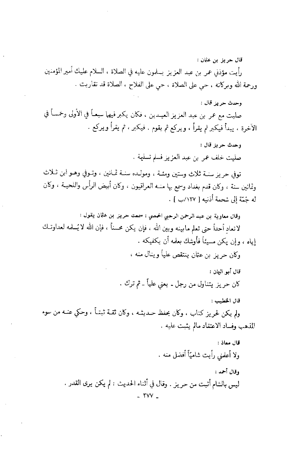 قال الخطيب: ولم يكن لحريز كتاب، وكان يحفظ حديثه، وكان ثقة ثبتاً، وحكي عنه من سوء المذهب وفساد الاعتقاد ما لم يثبت عليه.
