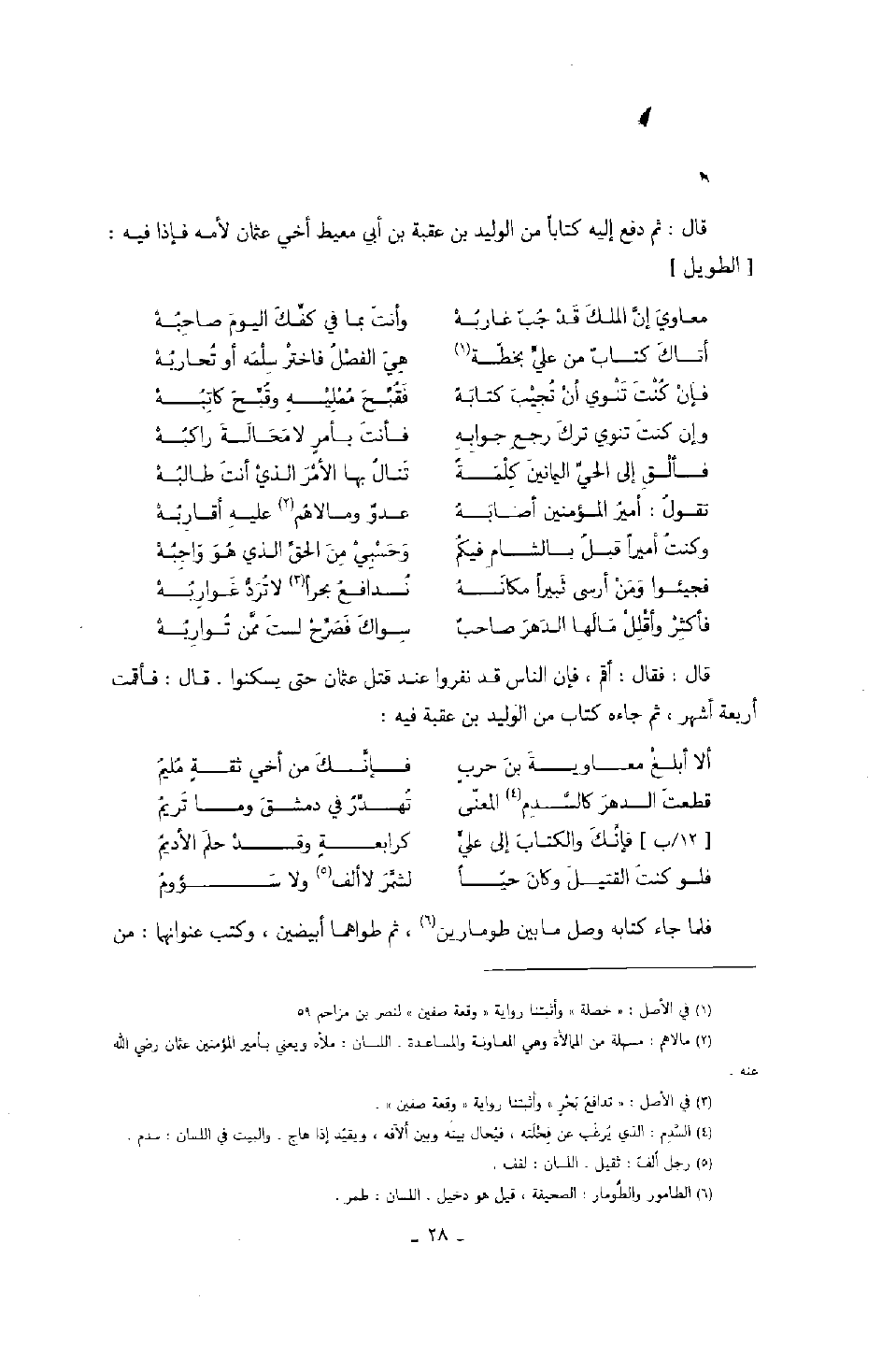 قال ثم دفع إليه كتاباً من الوليد بن عقبة بن أبي معيط أخي عثمان لأمه فإذا فيه: