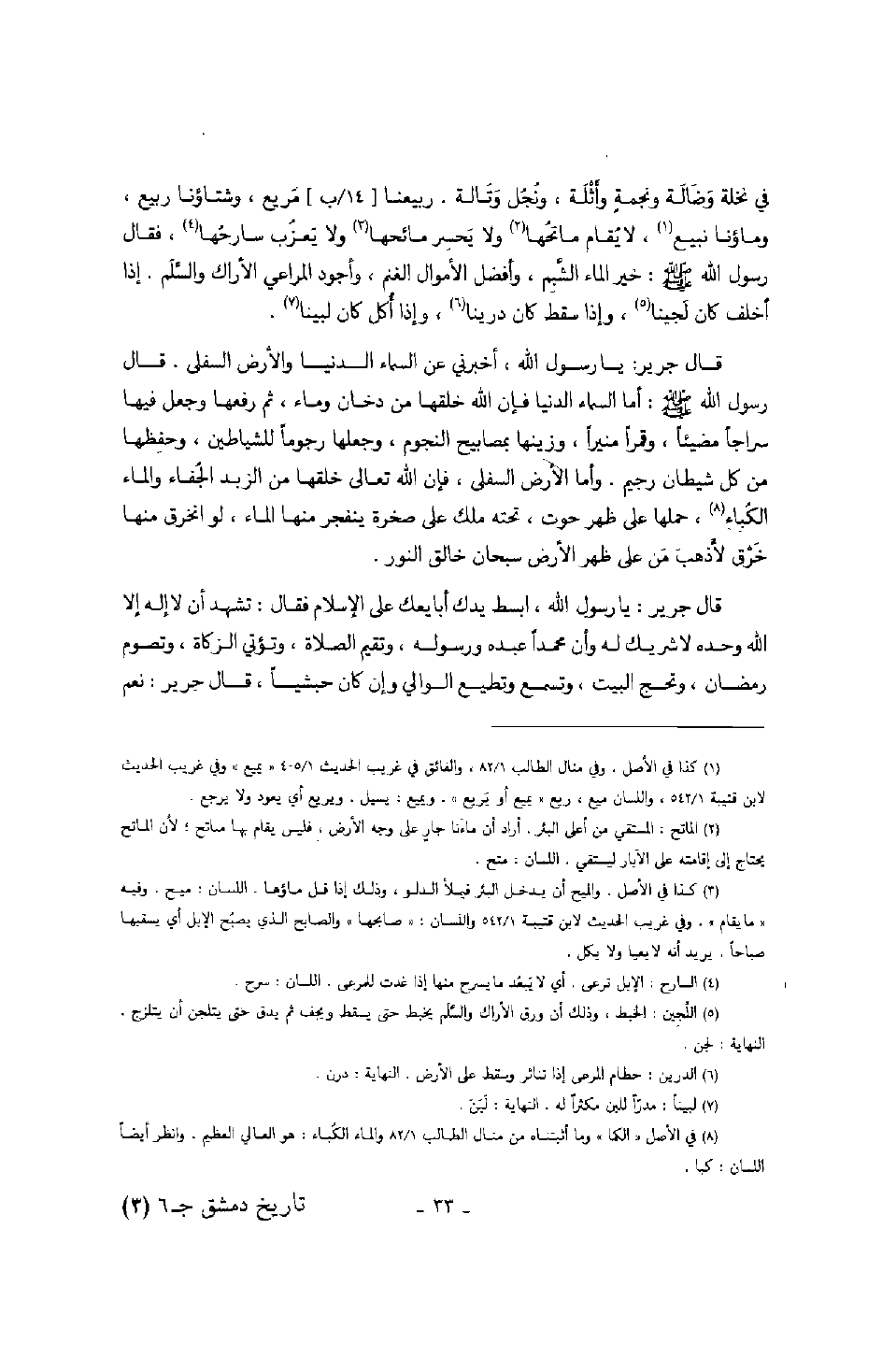 في نخلة وضالة ونجمة وأثلة، ونجل وتالة. ربيعنا مريع، وشتاؤنا ربيع، وماؤنا نبيع، لا يقام ماتحها ولا يحسر مائحها ولا يعزب سارحها، فقال رسول الله صلى اله عليه وسلم: " خير الماء الشبم، وأفضل الأموال الغنم، وأجود المراعي الأراك والسلم. وإذا أخلف كان لجينا، وإذا سقط كان درينا، وإذا أكل كان لبينا.