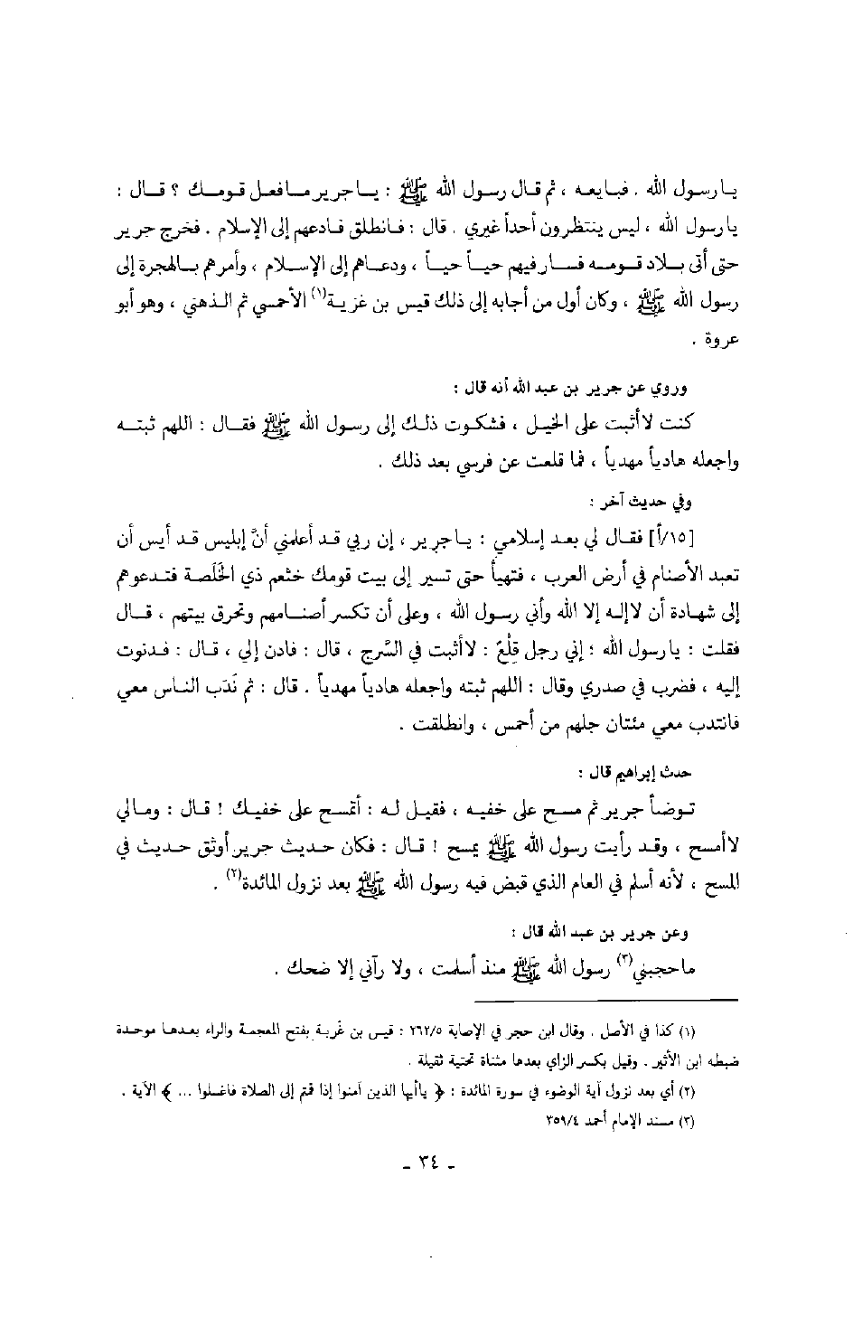حدث إبراهيم قال: توضأ جرير ثم مسح على خفيه، فقيل له: أتمسح على خفيك! قال: ومالي لا أمسح، وقد رأيت رسول الله صَلَّى اللهُ عَلَيْهِ وَسَلَّمَ يمسح! قال: فكان حديث جرير أوثق حديث في المسح، لأنه أسلم في العام الذي قبض فيه رسول الله صَلَّى اللهُ عَلَيْهِ وَسَلَّمَ بعد نزول المائدة.