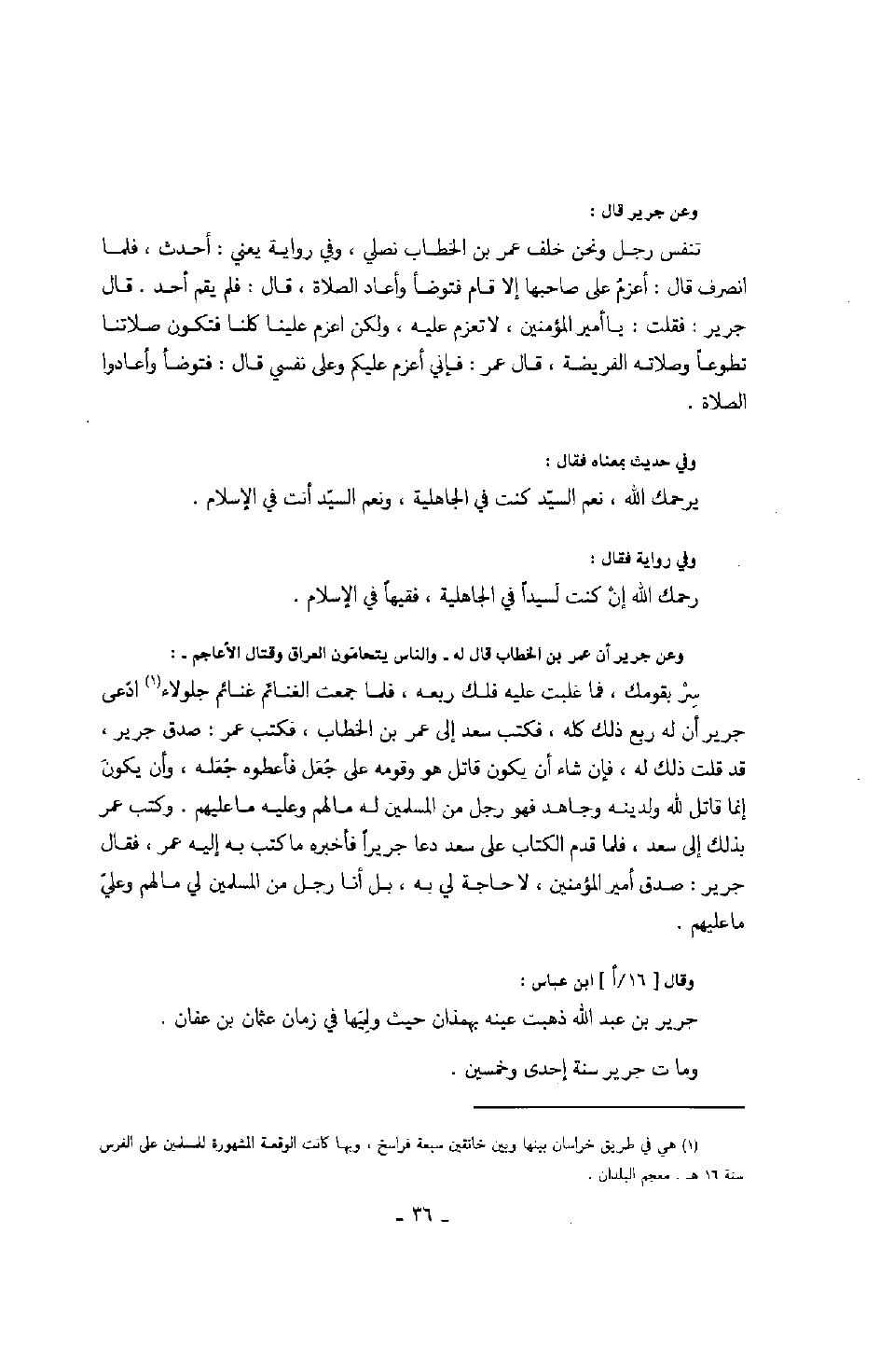 وعن جرير أن عمر بن الخطاب رضي الله عنه قال له - والناس يتحامون العراق وقتال الأعاجم -: سر بقومك، فما غلبت عليه فلك ربعه، فلما جمعت الغنائم غنائم جلولاء. ادعى جرير أن له ربع ذلك كله، فكتب سعد رضي الله عنه إلى عمر بن الخطاب رضي الله عنه، فكتب عمر رضي الله عنه: صدق جرير، قد قلت ذلك له، فإن شاء أن يكون قاتل هو وقومه على جعل فأعطوه جعله، وأن يكون إنما قاتل لله ولدينه وجاهد فهو رجل من المسلمين له مالهم وعليه ماعليهم. وكتب عمر رضي الله عنه بذلك إلى سعد رضي الله عنه، فلما قدم الكتاب على سعد دعا جريراً فأخبره ما كتب به إليه عمر، فقال جرير: صدق أمير المؤمنين، لاحاجة لي به، بل أنا رجل من المسلمين لي مالهم وعلي ماعليهم.
