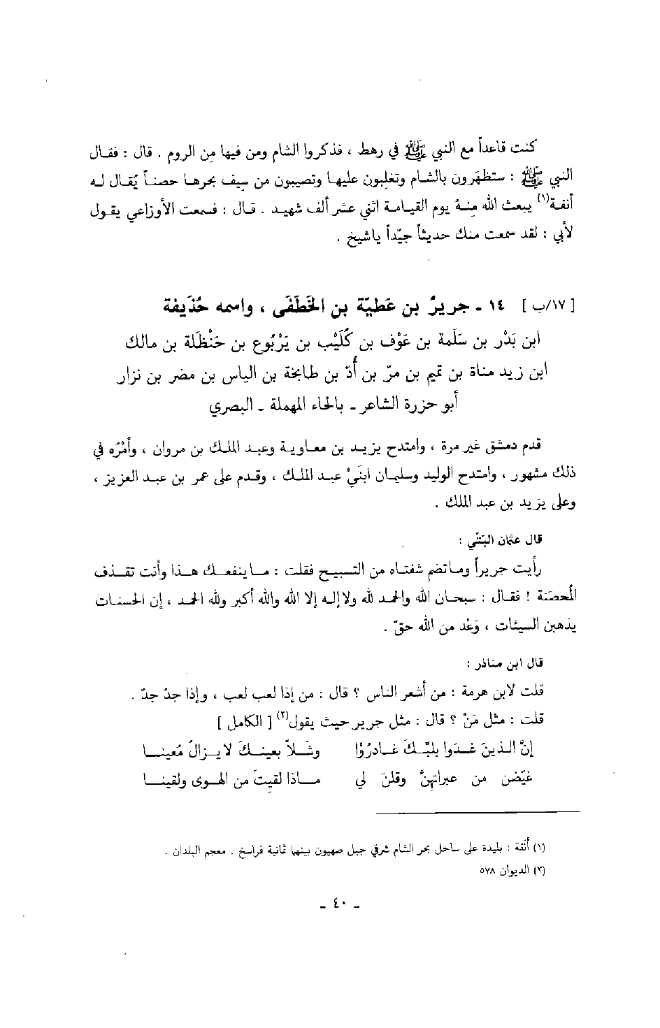قال عثمان البتي: رأيت جريراً وما تضم شفتاه من التسبيح فقلت: ما ينفعك هذا وأنت تقذف المحصنة! فقال: سبحان الله والحمد لله ولا اله إلا الله والله أكبر ولله الحمد، إن الحسنات يذهبن السيئات، وعد من الله حق.