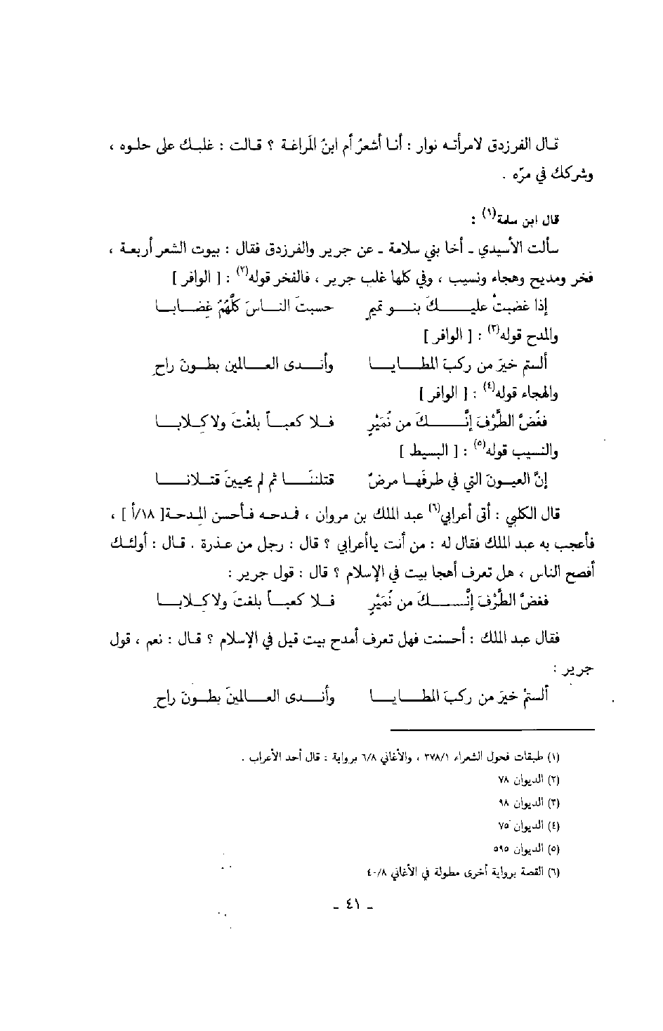 قال ابن سلمة: سألت الأسيدي - أخا بني سلمة - عن جرير والفرزدق فقال: بيوت الشعر أربعة، فخر ومديح وهجاء ونسيب، وفي كلها غلب جرير، فالفخر قوله: