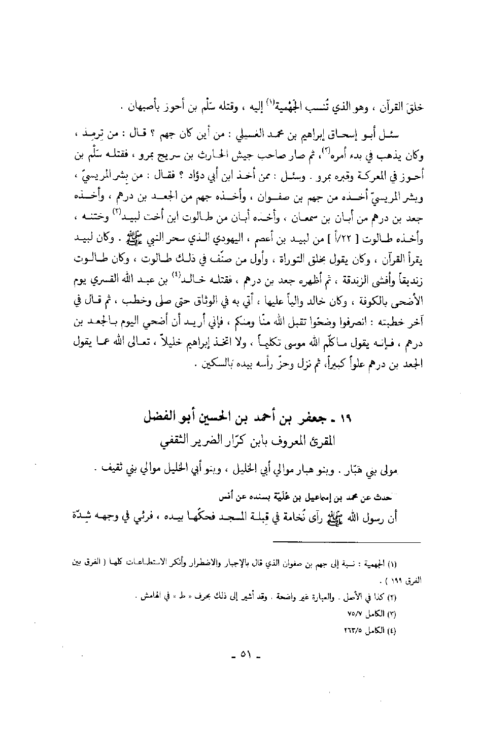 سئل أبو إسحاق إبراهيم بن محمد الغسيلي: من أين كان جهم؟ قال: من ترمذ، وكان يذهب في بدء أمره، ثم صار صاحب جيش الحارث بن سريج بمرو، فقتله سلم بن أحوز في المعركة وقبره بمرو. وسئل: ممن أخذ ابن أبي دؤاد؟ فقال: من بشر المريسي، وبشر المريسي أخذه من جهم بن صفوان، وأخذه جهم من الجعد بن درهم، وأخذه جعد بن درهم من أبان من طالوت ابن أخت لبيد وختنه، وأخذه طالوت من لبيد بن أعصم، اليهودي الذي سحر النبي صَلَّى اللهُ عَلَيْهِ وَسَلَّمَ. وكان لبيد يقرأ القرآن، وكان يقول بخلق التوراة، وأول من صنف في ذلك طالوت، وكان طالوت زنديقا وأفشى الزندقة، ثم أظهره جعد بن درهم، فقتله خالد بن عبد الله القسري يوم الأضحى بالكوفة، وكان خالد واليا عليها، أتي به في الوثاق حتى صلى وخطب، ثم قال في آخر خطبته: انصرفوا وضحوا تقبل الله منا ومنكم، فإني أريد أن أضحي اليوم بالجعد بن درهم، فإنه يقول ما كلم الله موسى تكليما، ولا اتخذ إبراهيم خليلا، تعالى الله عما يقول الجعد بن درهم علواً كبيراً، ثم نزل وحز رأسه بيده بالسكين.