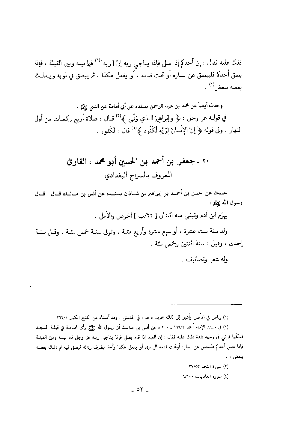 أبو محمد، القارئ المعروف بالسراج البغدادي حدث عن الحسن بن أحمد بن إبراهيم بن شاذان بسنده عن أنس بن مالك قال: قال رسول الله صَلَّى اللهُ عَلَيْهِ وَسَلَّمَ: يهرم ابن آدم وتبقى منه اثنتان الحرص والأمل.