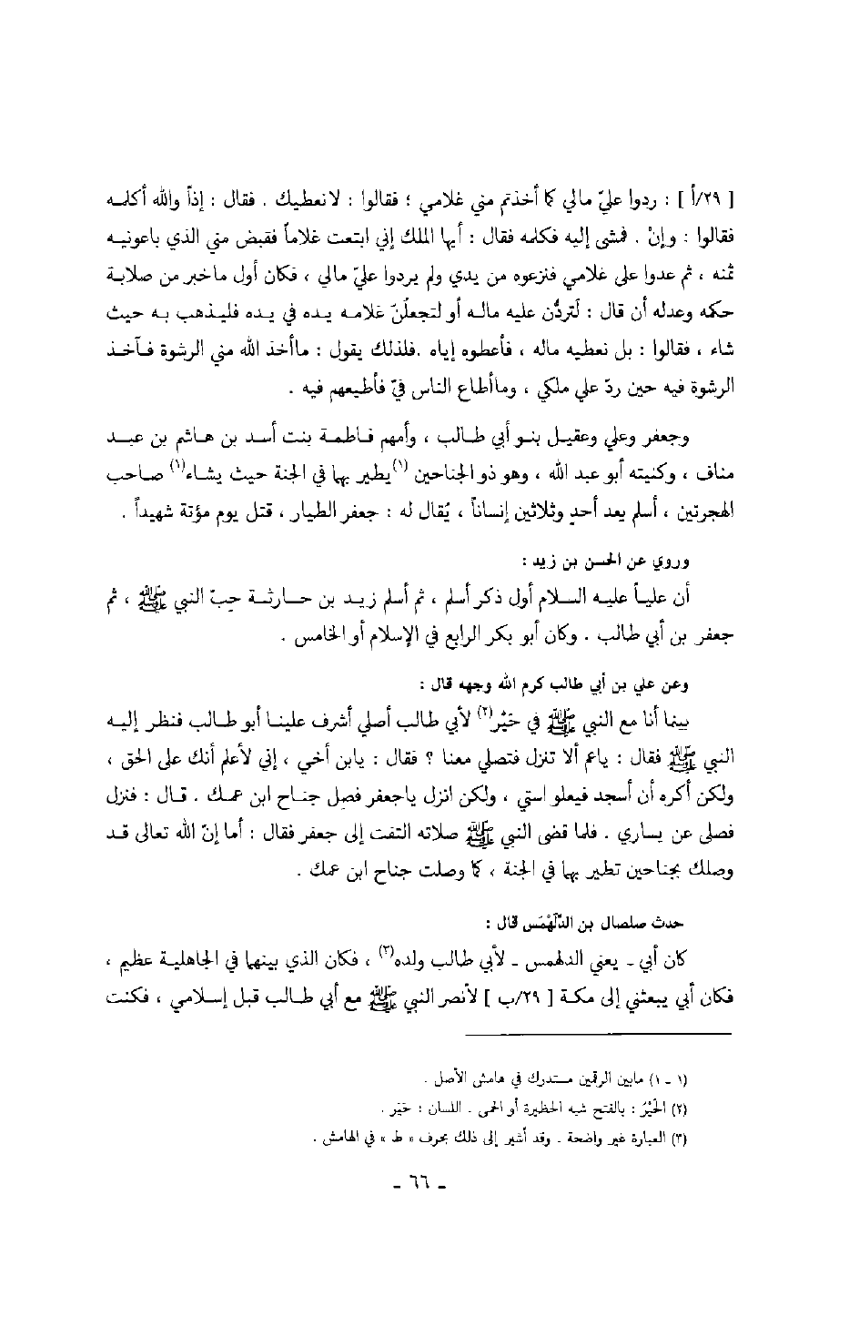 وعن علي بن أبي طالب كرم الله وجهه قال: بينما أنا مع النبي صَلَّى اللهُ عَلَيْهِ وَسَلَّمَ في حير لأبي طالب أصلي أشرف علينا أبو طالب فنظر إليه النبي صَلَّى اللهُ عَلَيْهِ وَسَلَّمَ فقال: يا عم ألا تنزل فتصلي معنا؟ فقال؟ يا بن أخي، إني لأعلم أنك على الحق، ولكن اكره أن أسجد فيعلو استي، ولكن انزل يا جعفر فصل جناح ابن عمك. قال: فنزل فصلى عن يساري. فلما قضى النبي صَلَّى اللهُ عَلَيْهِ وَسَلَّمَ صلاته التفت إلى جعفر فقال: أما إن الله تعالى قد وصلك بجناحين تطير بهما في الجنة، كما وصلت جناح ابن عمك.