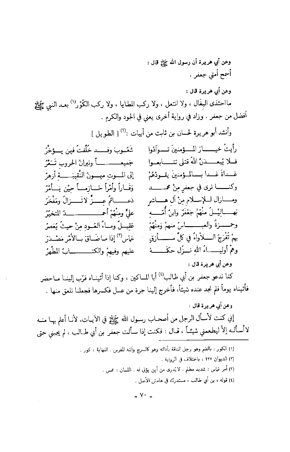 وعن أبي هريرة رضي الله عنه قال: ما احتذى البغال، ولا انتعل، ولا ركب المطايا، ولا ركب الكور بعد النبي صَلَّى اللهُ عَلَيْهِ وَسَلَّمَ أفضل من جعفر. وزاد في رواية أخرى يعني في الجود والكرم.