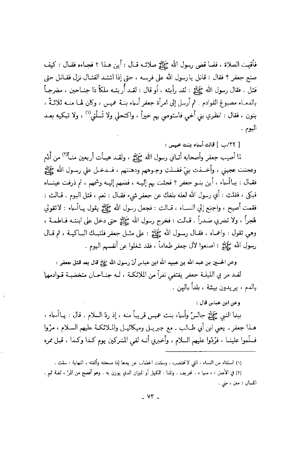 فأقيمت الصلاة، فلما قضى رسول الله صَلَّى اللهُ عَلَيْهِ وَسَلَّمَ صلاته قال: " أين هو؟ فجاءه فقال: كيف صنع جعفر؟ فقال: قاتل يا رسول الله على فرسه، حتى إذا اشتد القتال نزل فقاتل حتى قتل. فقال رسول الله صَلَّى اللهُ عَلَيْهِ وَسَلَّمَ " لقد رأيته، أو قال: لقد أريته ملكا ذا جناحين، مضرجاً بالدماء مصبوغ القوادم ". ثم أرسل إلى امرأة جعفر أسماء ابنة عميس، وكان لها منه ثلاثة، بنون، فقال: " انظري بني أخي فاستوصي بهم خيراً، واكتحلي ولا تسلتي، ولا تبكيه بعد اليوم " قالت أسماء بنت عميس: لما أصبي جعفر وأصحابه أتاني رسول الله صَلَّى اللهُ عَلَيْهِ وَسَلَّمَ، ولقد هيأت أربعين مناً من أدم وعجنت عجيني، وأخذت بني فغسلت وجوههم ودهنتهم، فدخل علي رسول الله صَلَّى اللهُ عَلَيْهِ وَسَلَّمَ فقال: " يا أسماء، أين بنو جعفر؟ فجئت بهم إليه، فضمهم إليه وشمهم، ثم ذرفت عيناه فبكى، فقلت: أي رسول الله لعله بلغك عن جعفر شيء فقال: نعم، قتل اليوم ". قالت: فقمت أصيح، واجتمع إلي النساء، قالت: فجعل رسول الله صَلَّى اللهُ عَلَيْهِ وَسَلَّمَ يقول: " يا أسماء، لا تقولي هجراً، ولا تضربي صدراً ". قالت: فخرج رسول الله صَلَّى اللهُ عَلَيْهِ وَسَلَّمَ حتى دخل على ابنته فاطمة، وهي تقول: واعماه، فقال رسول الله صَلَّى اللهُ عَلَيْهِ وَسَلَّمَ: " على مثل جعفر فلتبك الباكية "، ثم قال رسول الله صَلَّى اللهُ عَلَيْهِ وَسَلَّمَ: " اصنعوا لآل جعفر طعاماً، فقد شغلوا عن أنفسهم اليوم ".