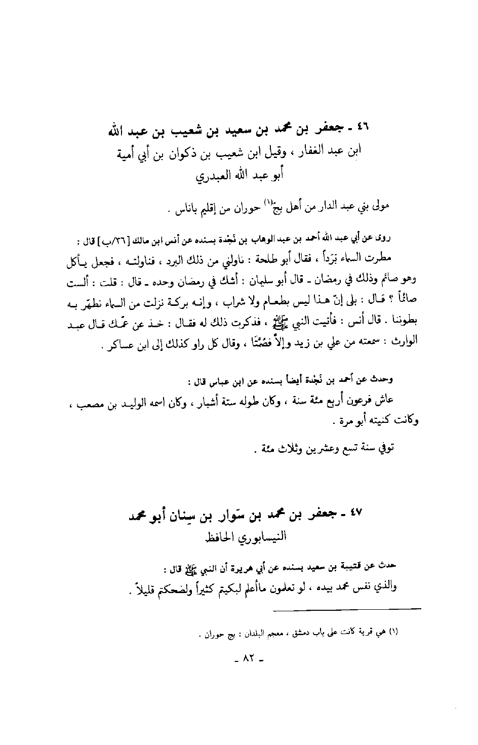 أبو محمد النيسابوري الحافظ حدث عن قتيبة بن سعيد بسنده عن أبي هريرة أن النبي صَلَّى اللهُ عَلَيْهِ وَسَلَّمَ قال: " والذي نفس محمد بيده، لو تعلمون ما أعلم لبكيتم كثيراً ولضحكتم قليلاً ".