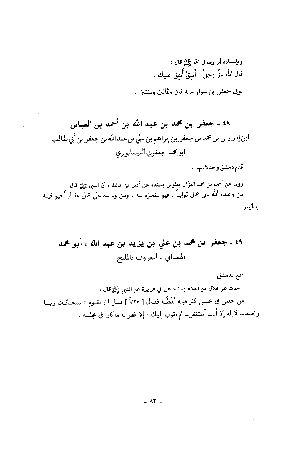ابن أحمد بن العباس بن إدريس بن محمد بن جعفر بن إبراهيم بن علي بن عبد الله بن جعفر ابن أبي طالب أبو محمد الجعفري النيسابوري قدم دمشق وحدث بها.