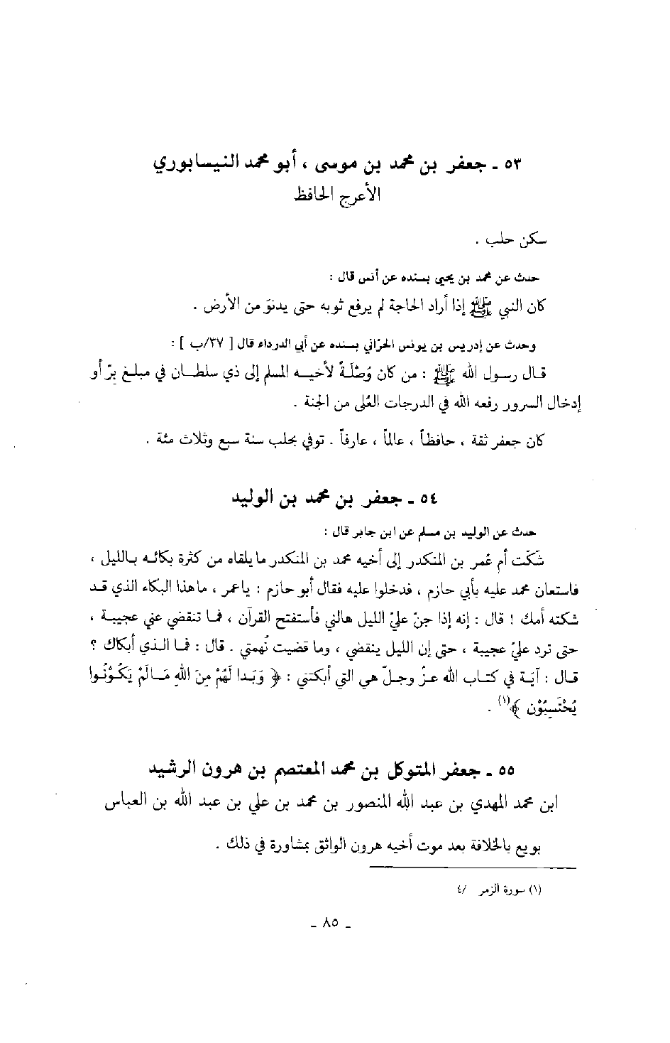 كان جعفر ثقة، حافظاً، عالماً، عارفاً. توفي بحلب سنة سبع وثلاث مئة.