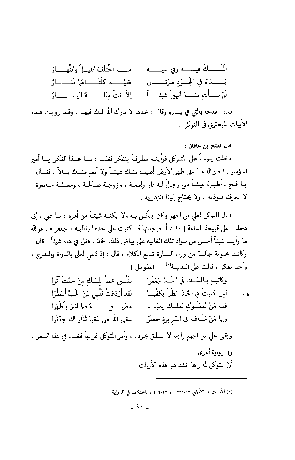 وبقي علي بن الجهم واجماً لا ينطق بحرف، وأمر المتوكل عريباً فغنت في هذا الشعر.