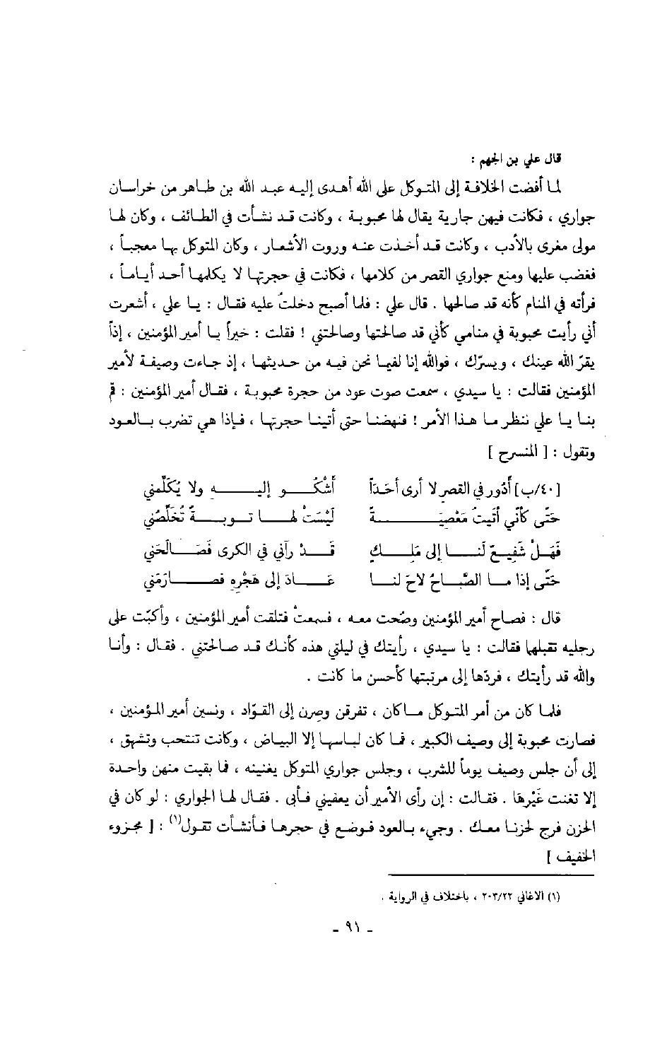 قال علي بن الجهم: لما أفضت الخلافة إلى المتوكل على الله أهدى إليه عبد الله بن طاهر من خراسان جواري، فكانت فيهن جارية يقال لها محبوبة، وكانت قد نشأت في الطائف، وكان لها مولى مغرى بالأدب، وكانت قد أخذت عنه وروت الأشعار، وكان المتوكل بها معجباً، فغضب عليها ومنع جواري القصر من كلامها، فكانت في حجرتها لا يكلمها أحد أياماً، فرأته في المنام كأنه قد صالحها. قال علي: فلما أصبح دخلت عليه فقال: يا علي، أشعرت أني رأيت محبوبة في منامي كأني قد صالحتها وصالحتني! فقلت: خيراً يا أمير المؤمنين، إذاً يقر الله عينك، ويسرك، فوالله إنا لفيما نحن فيه من حديثها، إذ جاءت وصيفة لأمير المؤمنين فقالت: يا سيدي، سمعت صوت عود من حجرة محبوبة، فقال أمير المؤمنين: قم بنا يا علي ننظر ما هذا الأمر! فنهضنا حتى أتينا حجرتها، فإذا هي تضرب بالعود وتقول: