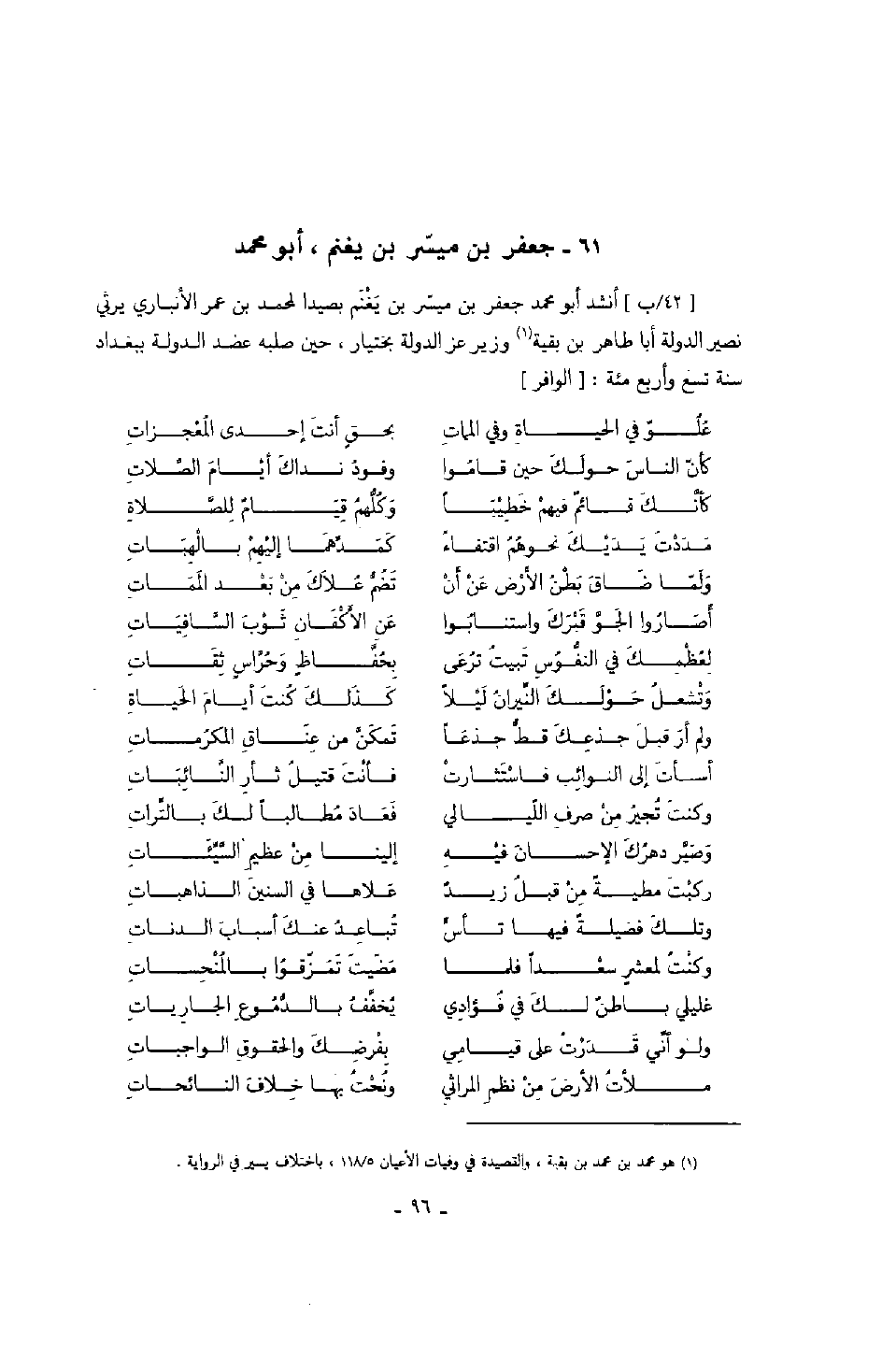 أنشد أبو محمد جعفر بن يغنم بصيدا لمحمد بن عمر الأنباري يرثي نصير الدولة أبا طاهر بن بقية وزير عز الدولة بختيار، حين صلبه عضد الدولة ببغداد سنة تسع وأربع مائة:
