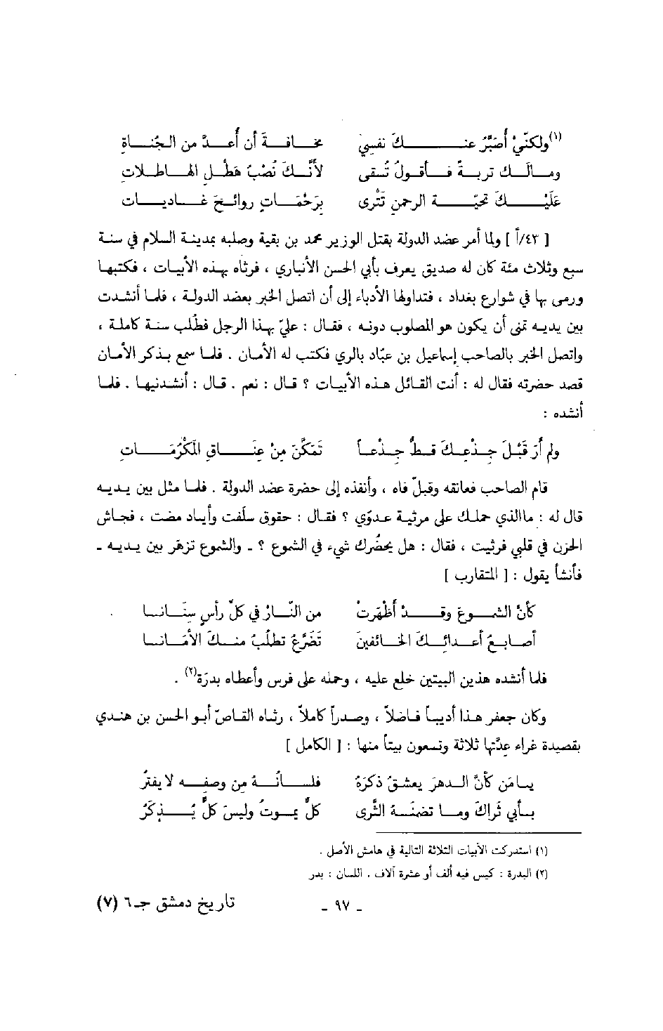 قام الصاحب فعانقه وقبل فاه، وأنفذه إلى حضرة عضد الدولة. فلما مثل بين يديه قال له: ما الذي حملك على مرثية عدوي؟ فقال: حقوق سلفت وأياد مضت، فجاش الحزن في قلبي فرثيت، فقال: هل يحضرك شيء في الشموع؟ - والشموع تزهر بين يديه - فأنشأ يقول: