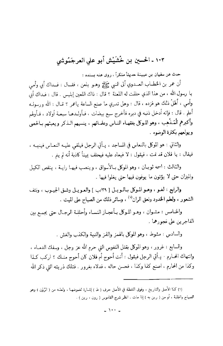 أبو علي العرجموشي حدث عن سفيان بن عيينة حديثاً منكراً، روى عنه بسنده: أن عمر بن الخطاب العدوي أتى النبي صَلَّى اللهُ عَلَيْهِ وَسَلَّمَ وهو يلعن، فقال: فداك أبي وأمي يا رسول الله، من هذا الذي حللت له اللعنة؟ قال: ذاك اللعين إبليس. قال: فداك أبي وأمي، أهل ذلك هو فزده، قال: وهل تدري ما صنع الساعة يا عمر؟ قال: الله ورسوله أعلم. قال: فإنه أدخل ذنبه في دبره فأخرج سبع بيضات، فأولدها سبعة أولاد، فأولهم وأكبرهم المذهب، وهو الموكل بفقهاء الناس وعلمائهم، ينسيهم الذكر ويعبثهم بالحصى ويولعهم بكثرة الوضوء.