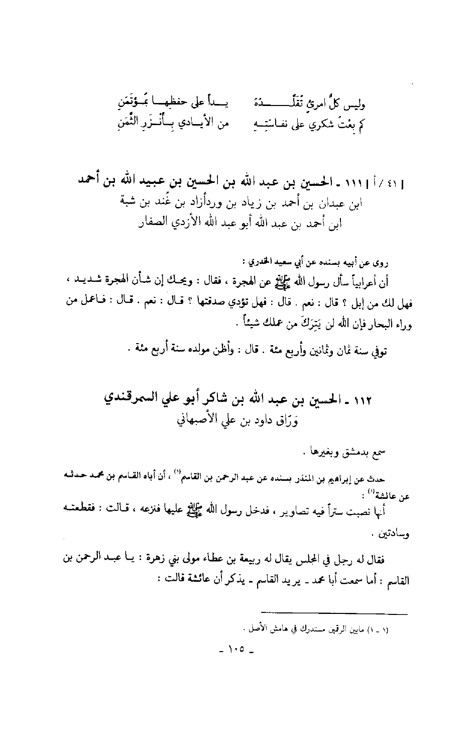 ابن عبيد الله بن أحمد ابن عبدان بن أحمد بن زياد بن ورد أزاد بن غند بن شبة ابن أحمد بن عبد الله الأزدي الصفار روى عن أبيه بسنده عن أبي سعيد الخدري: أن أعرابياً سأل رسول الله صَلَّى اللهُ عَلَيْهِ وَسَلَّمَ عن الهجرة، فقال: ويحك إن شأن الهجرة شديد، فهل لك من إبل؟ قال: نعم. قال: فهل تؤدي صدقتها؟ قال: نعم. قال: فاعمل من وراء البحار فإن الله لن يترك من عملك شيئاً.