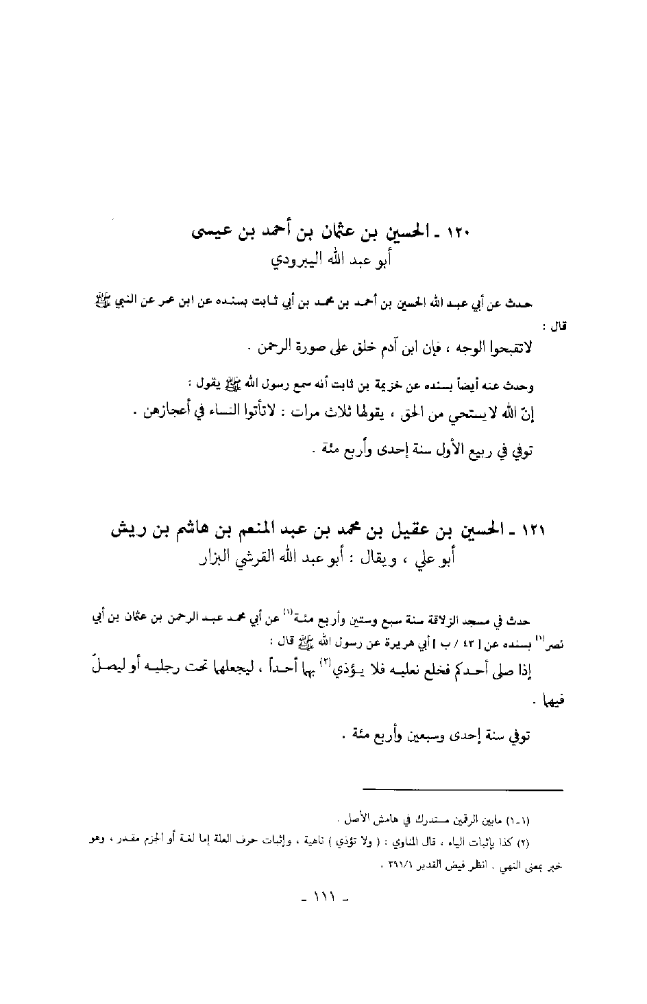 ابن عيسى أبو عبد الله اليبرودي حدث عن أبي عبد الله الحسين بن أحمد بن محمد بن أبي ثابت بسنده عن ابن عمر عن النبي صَلَّى اللهُ عَلَيْهِ وَسَلَّمَ قال: لا تقبحوا الوجه، فإن ابن آدم خلق على صورة الرحمن.
