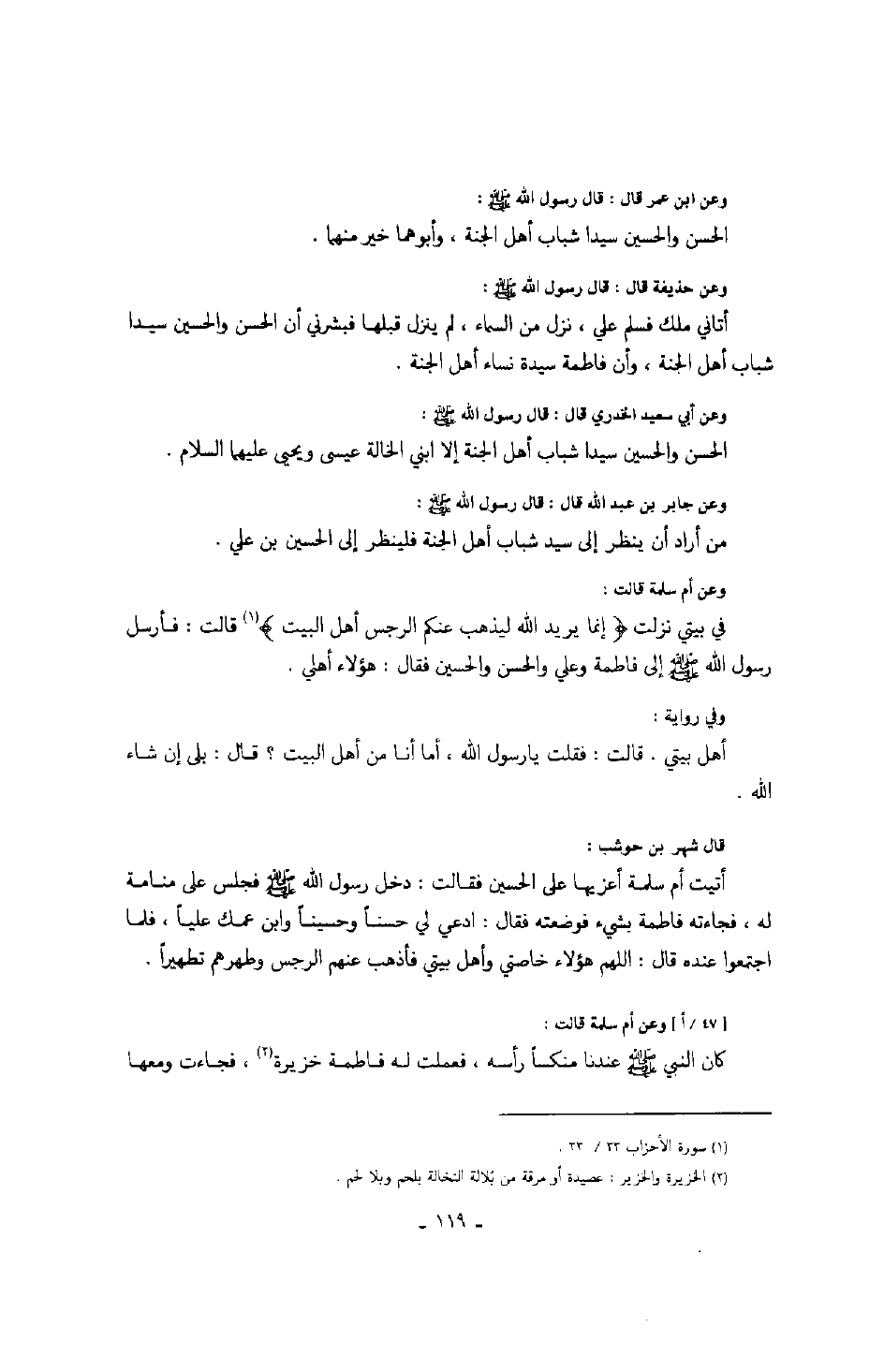 قال شهر بن حوشب: أتيت أم سلمة أعزيها على الحسين فقالت: دخل رسول الله صَلَّى اللهُ عَلَيْهِ وَسَلَّمَ فجلس على منامة له، فجاءته فاطمة بشيء فوضعته فقال: ادعي لي حسناً وحسيناً وابن عمك علياً، فلما اجتمعوا عنده قال: اللهم هؤلاء خاصتي وأهل بيتي فأذهب عنهم الرجس وطهرهم تطهيراً.