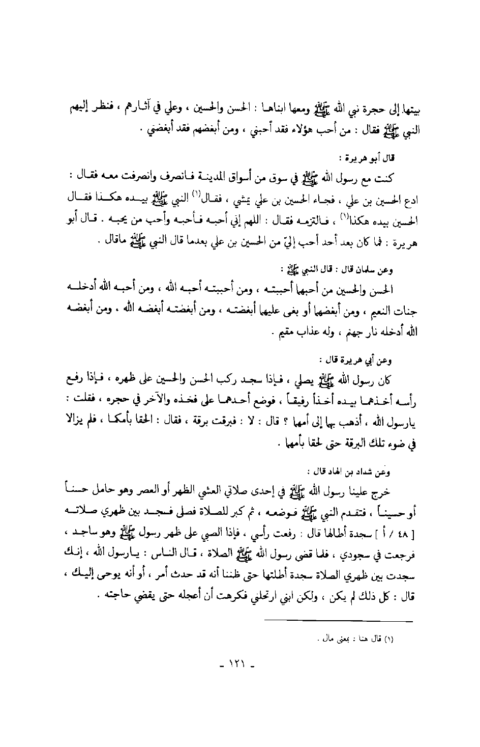 كان رسول الله صَلَّى اللهُ عَلَيْهِ وَسَلَّمَ يصلي، فإذا سجد ركب الحسن والحسين على ظهره، فإذا رفع رأسه أخذهما بيده أخذاً رفيقاً، فوضع أحدهما على فخذه والآخر في حجره، فقلت: يا رسول الله، أذهب بهما إلى أمهما؟ قال: لا: فبرقت برقة، فقال: الحقا بأمكما، فلم يزالا في ضوء تلك البرقة حتى لحقا بأمهما.