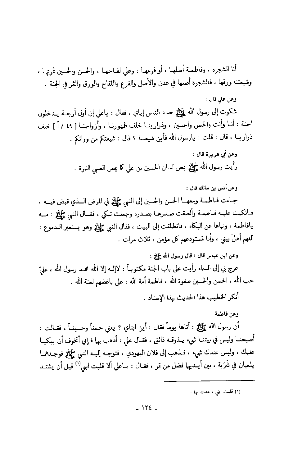 وعن ابن عباس قال: قال رسول الله صَلَّى اللهُ عَلَيْهِ وَسَلَّمَ: عرج بي إلى السماء رأيت على باب الجنة مكتوباً: لا إله إلا الله محمد رسول الله، علي حب الله، الحسن والحسين صفوة الله، فاطمة أمة الله، على باغضهم لعنة الله.