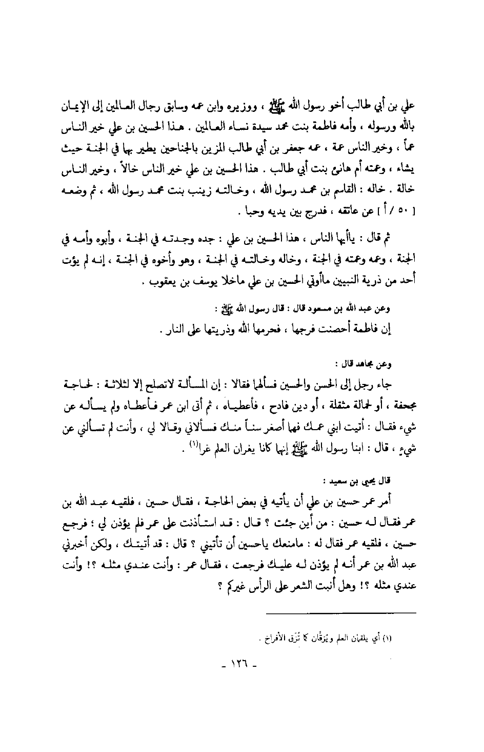 قال يحيى بن سعيد: أمر عمر حسين بن علي أن يأتيه في بعض الحاجة، فقال حسين، فلقيه عبد الله بن عمر فقال له حسين: من أين جئت؟ قال: قد استأذنت على عمر فلم يؤذن لي؛ فرجع حسين، فلقيه عمر فقال له: ما منعك يا حسين أن تأتيني؟ قال: قد أتيتك، ولكن أخبرني عبد الله بن عمر أنه لم يؤذن له عليك فرجعت، فقال عمر: وأنت عندي مثله؟! وأنت عندي مثله؟! وهل أنبت الشعر على الرأس غيركم؟