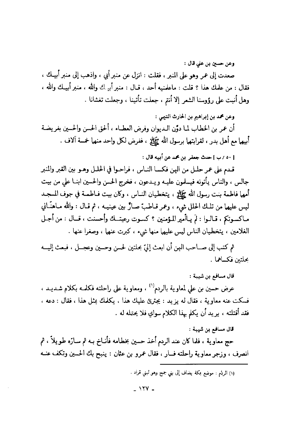 قال مسافع بن شيبة: حج معاوية، فلما كان عند الردم أخذ حسين بخطامه فأناخ به ثم ساره طويلاً، ثم انصرف، وزجر معاوية راحلته فسار، فقال عمرو بن عثمان: ينبح بك الحسين وتكف عنه