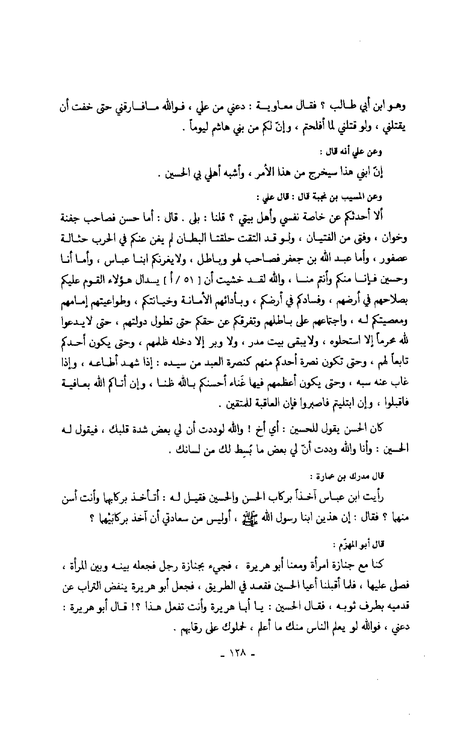 كان الحسن يقول للحسين: أي أخ! والله لوددت أن لي بعض شدة قلبك، فيقول له الحسين: وأنا والله وددت أن لي بعض ما بسط لك من لسانك.