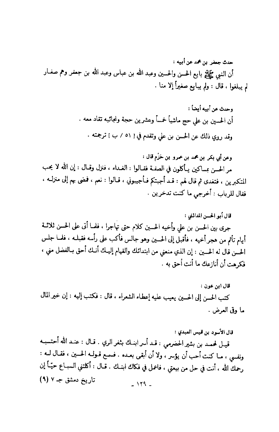 وحدث عن أبيه أيضاً: أن الحسين بن علي حج ماشياً خمساً وعشرين حجة ونجائبه تقاد معه.