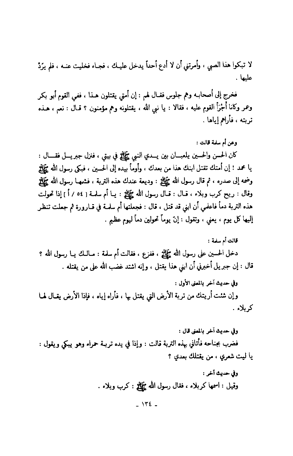 وفي حديث آخر بالمعنى قال: فضرب بجناحه فأتاني بهذه التربة قالت: وإذا في يده تربة حمراء وهو يبكي ويقول: يا ليت شعري، من يقتلك بعدي؟ وفي حديث آخر: وقيل: اسمها كربلاء، فقال رسول الله صَلَّى اللهُ عَلَيْهِ وَسَلَّمَ: كرب وبلاء.