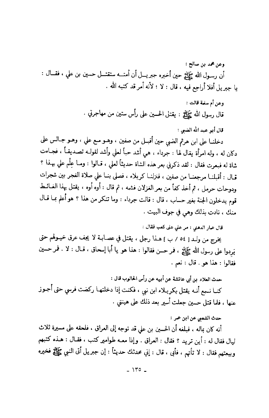 وعن محمد بن صالح: أن رسول الله صَلَّى اللهُ عَلَيْهِ وَسَلَّمَ حين أخبره جبريل أن أمته ستقتل حسين بن علي، فقال: يا جبريل أفلا أراجع فيه، قال: لا؛ لأنه أمر قد كتبه الله.