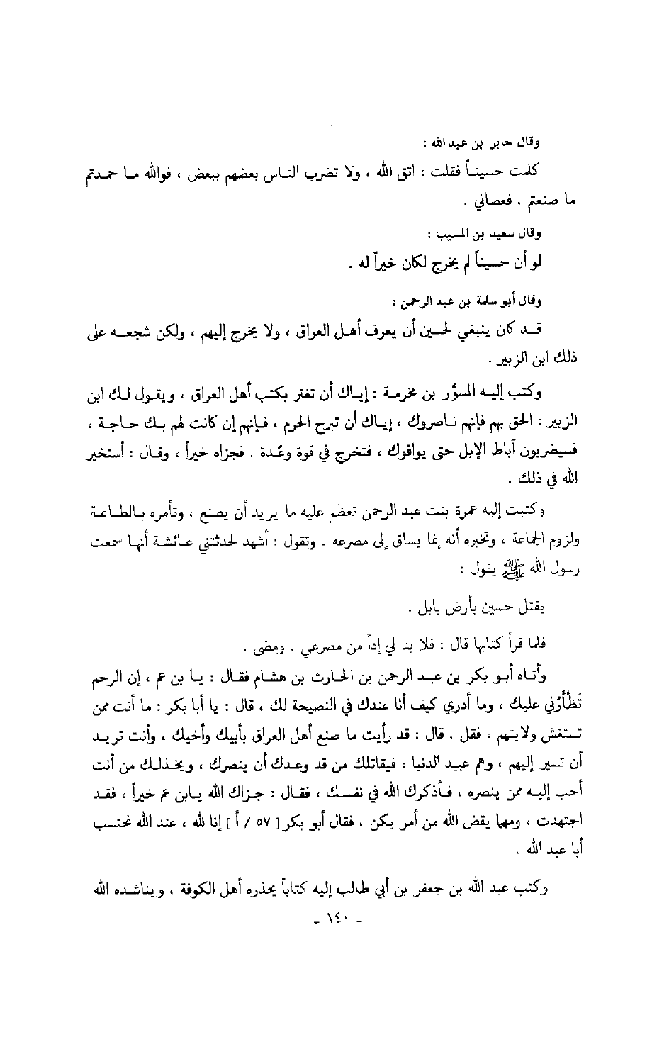 وقال جابر بن عبد الله: كلمت حسيناً فقلت: اتق الله، ولا تضرب الناس بعضهم ببعض، فوالله ما حمدتم ما صنعتم. فعصاني.